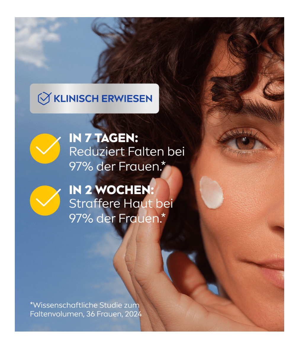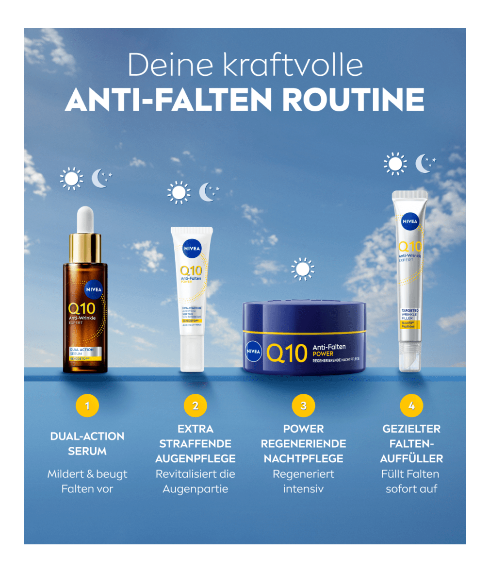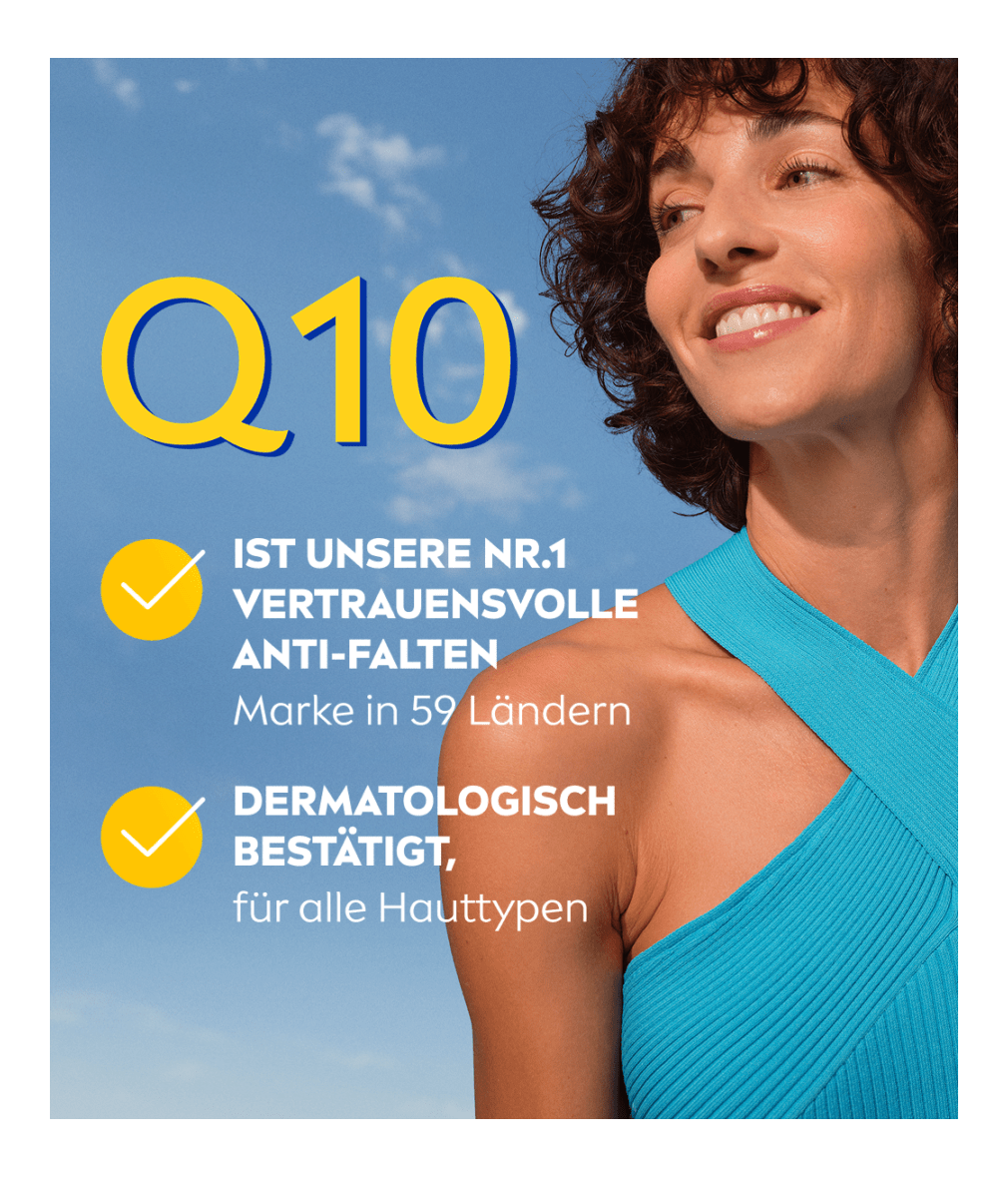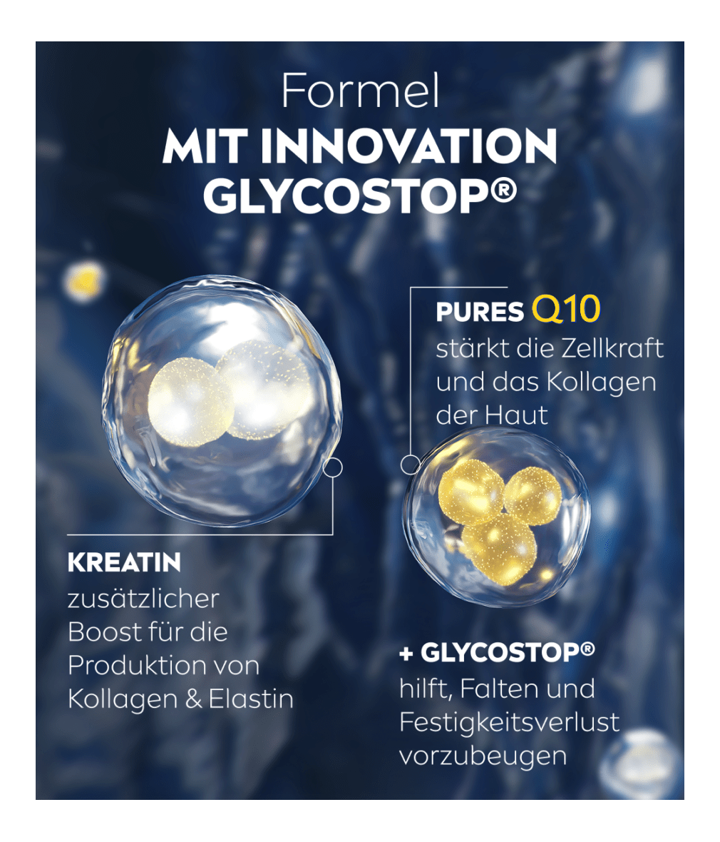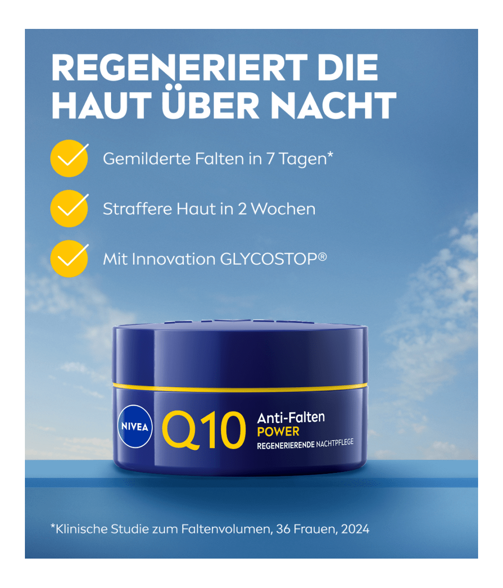 NIVEA Q10 Anti-Falten Nachtpflege mit GLYCOSTOP® ist angereichert mit der Zweifach Wirkung vom Coenzym Q10 & Kreatin, um eine 24h Anti-Falten-Wirkung zu gewährleisten – für sichtbar straffere Haut und gemilderte Falten in 7 Tagen.