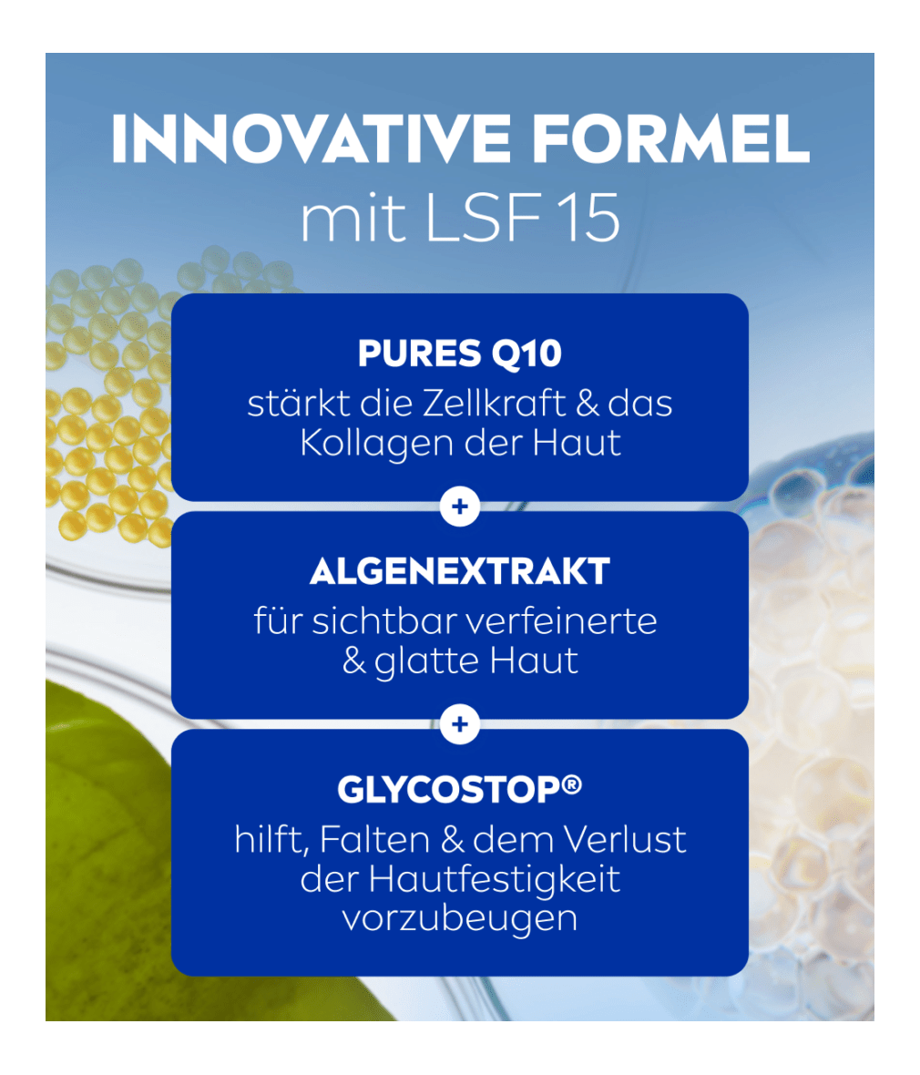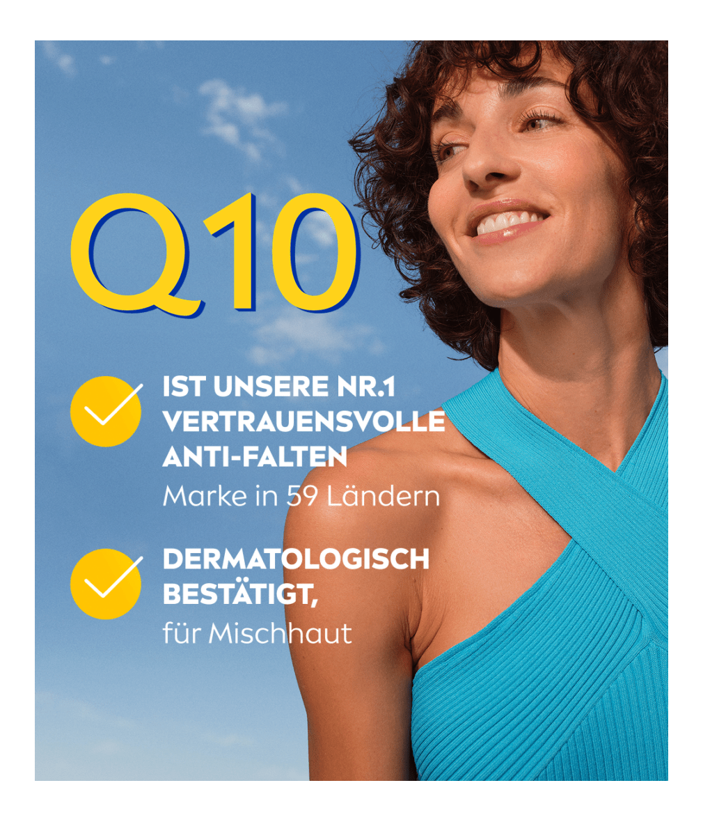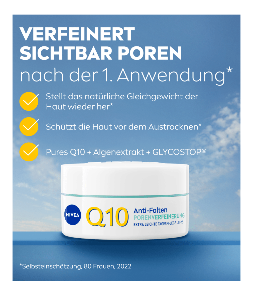 NIVEA Q10 Anti-Falten porenverfeinernde Tagespflege mit GLYCOSTOP® enthält Q10, das zu 100 % identisch mit dem körpereigenen ist. Die reine und natürliche Qualität des Coenzyms harmoniert perfekt mit Mischhaut und verfeinert das Hautbild.