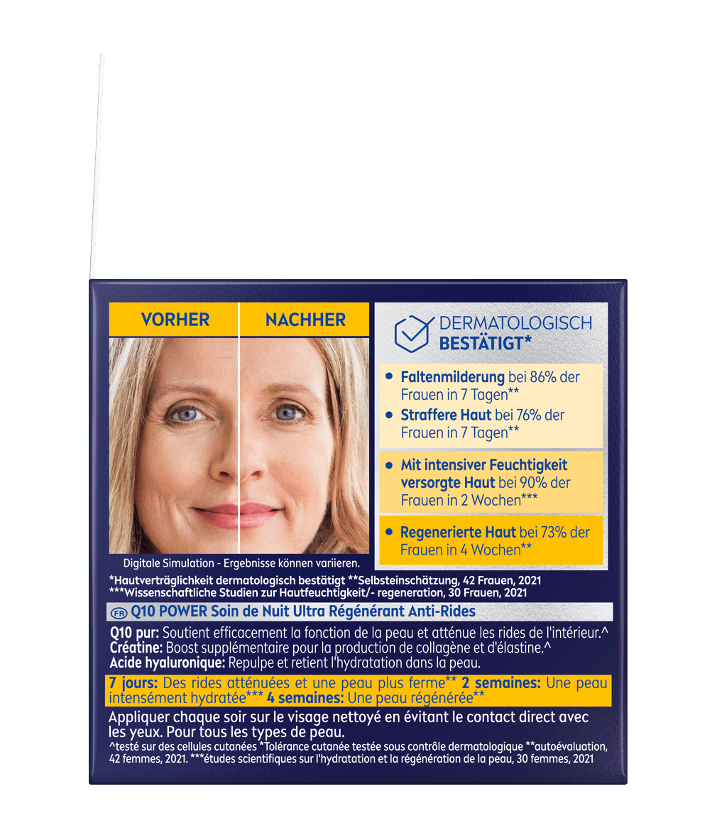 Die NIVEA Q10 Anti-Falten POWER Nachtpflege mildert Falten in 7 Tagen dank 2x Kollagen Booster purem Q10 und Kreatin. Die Haut wird gestrafft und gleichzeitig neuen Falten vorgebeugt. Angereichert mit Hyaluronsäure, spendet die Nachtpflege intensive Feuchtigkeit und regeneriert die Haut über Nacht.