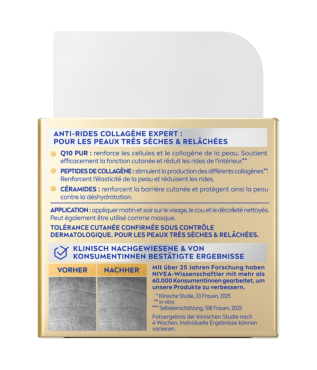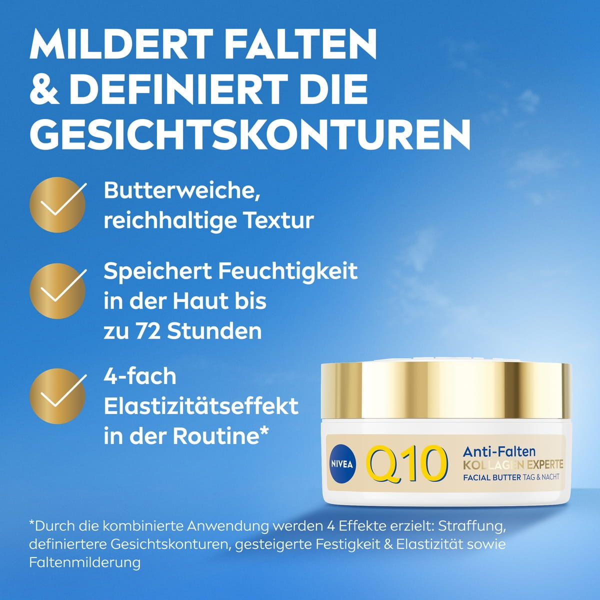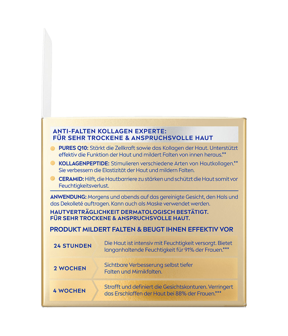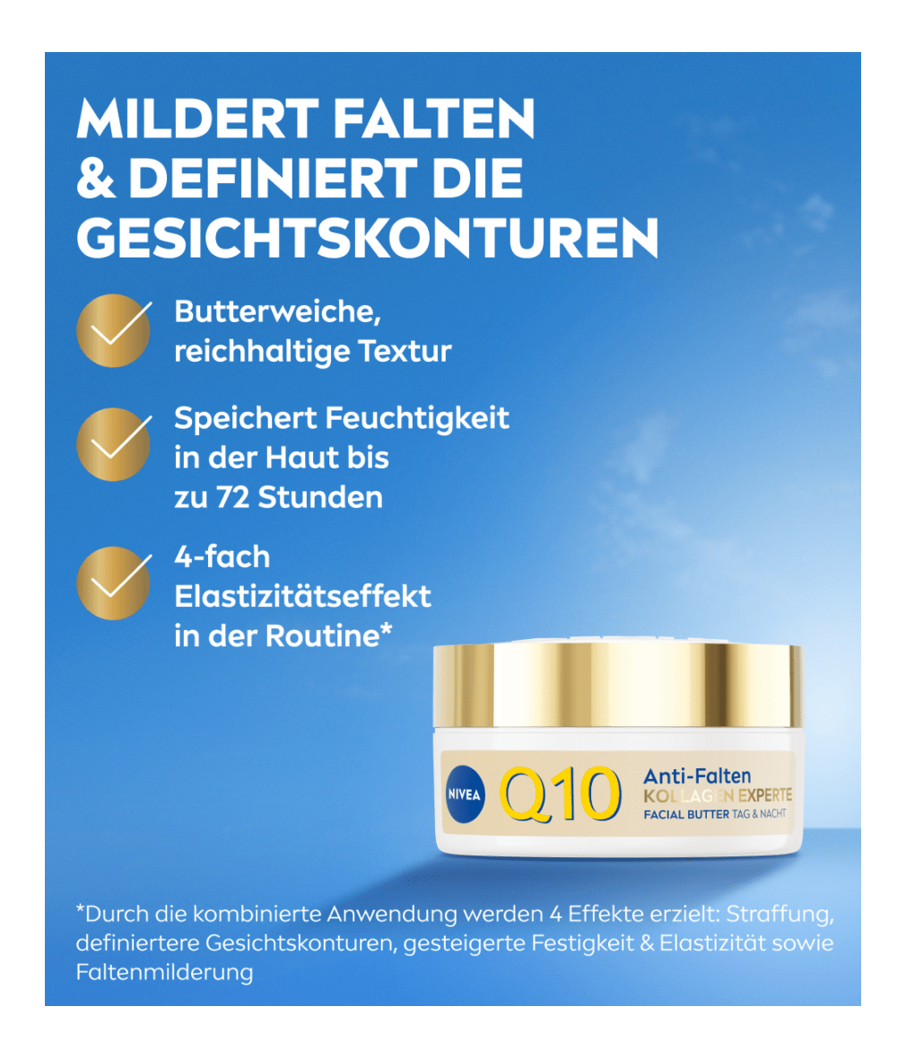 Q10 Anti-Falten Kollagen Experte FACIAL BUTTER TAG & NACHT ist formuliert, um die Haut tiefgehend zu pflegen, ihre reichhaltige, buttrige Textur zieht tief in die Haut ein, stärkt die Feuchtigkeitsbarriere der Haut.