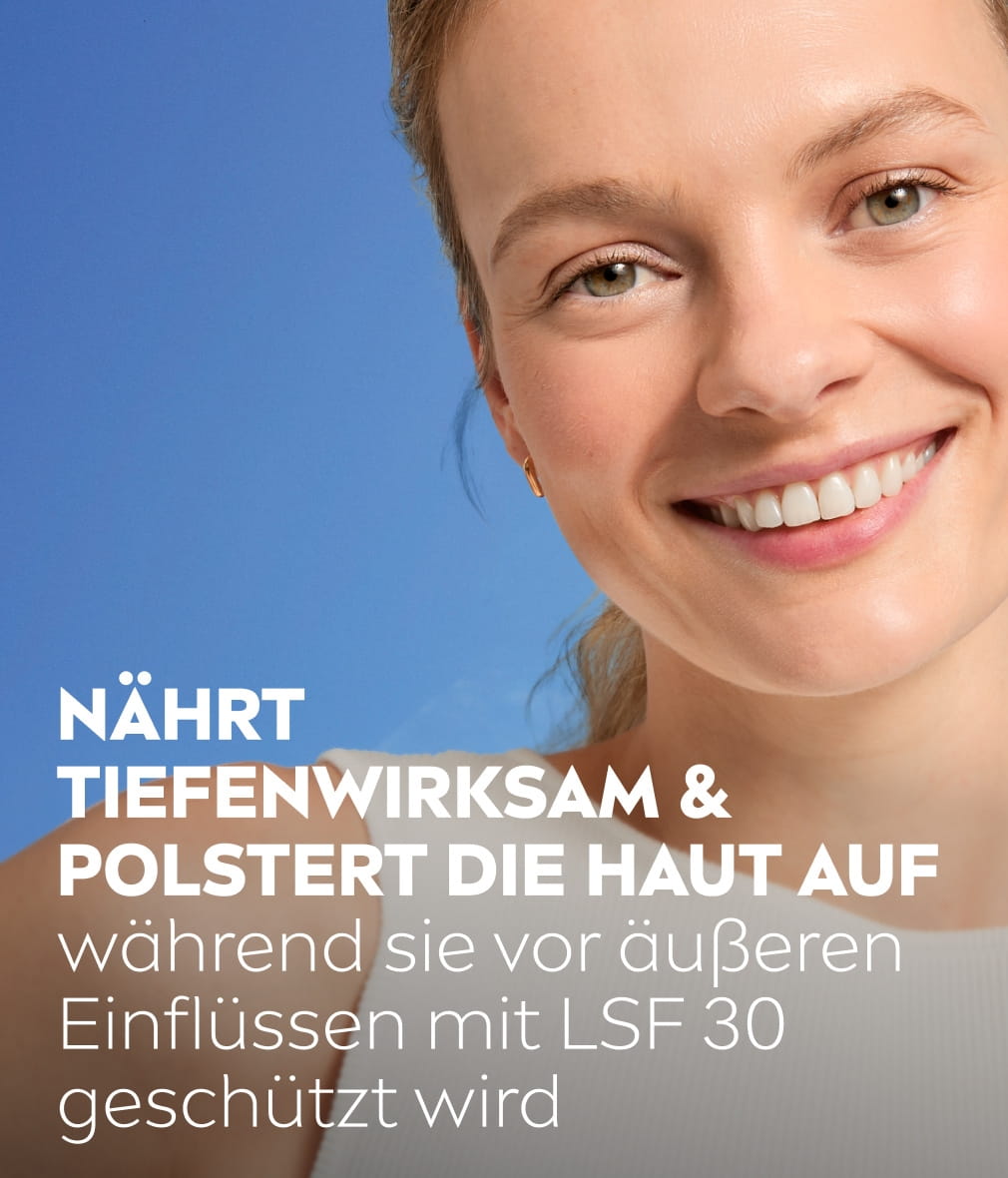 Diese seidig-zarte Tagespflege für trockene Haut verschmilzt mit deiner Haut. Sie wird tiefenwirksam mit Feuchtigkeit versorgt, fühlt sich geschmeidig und widerstandsfähig an – LSF 30 schützt vor sonnenlichtbedingten Einflüssen | 50ml