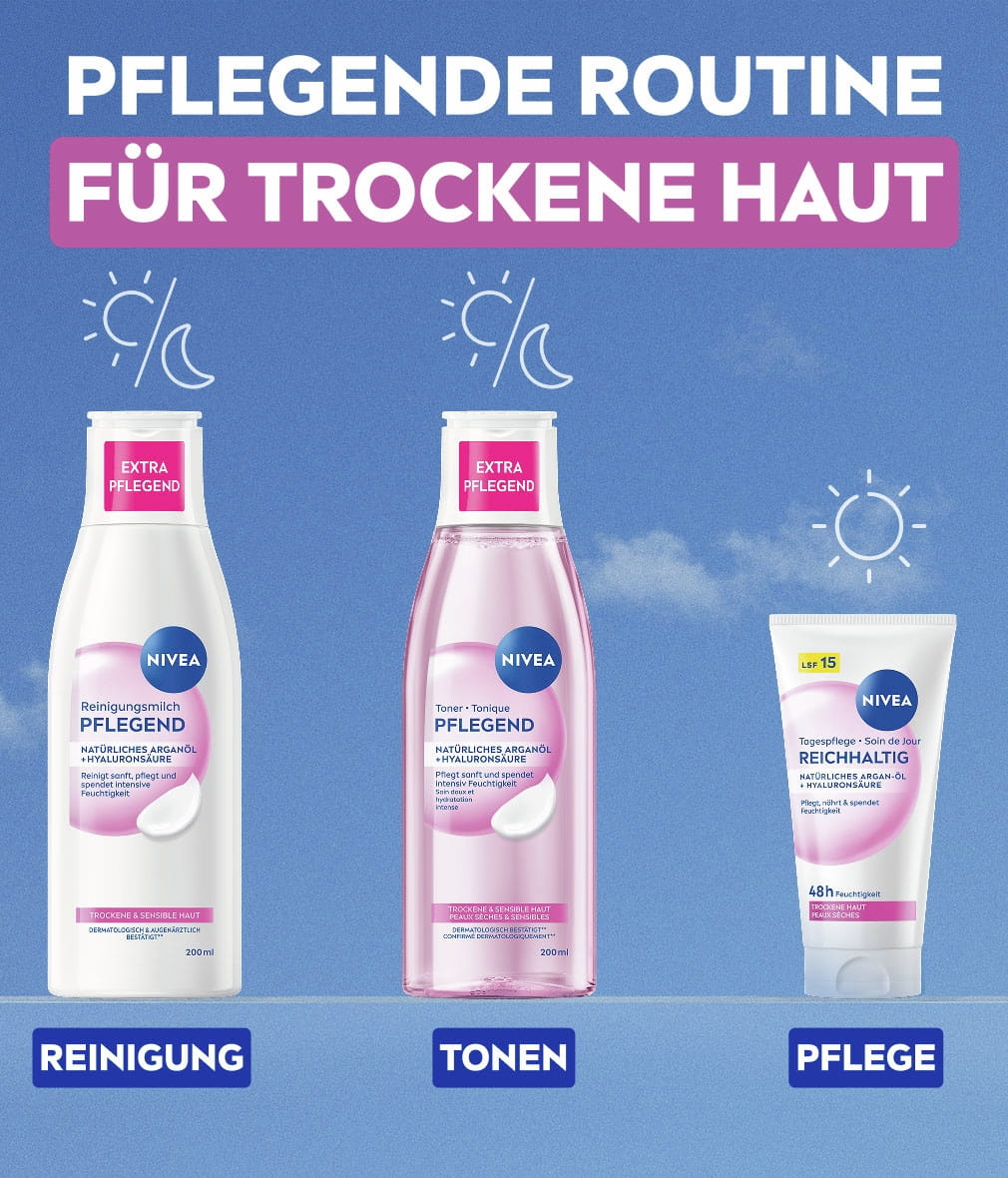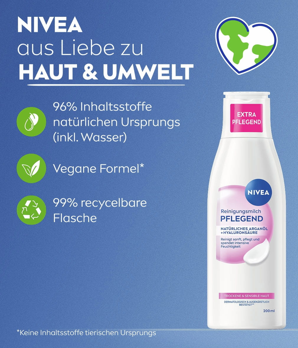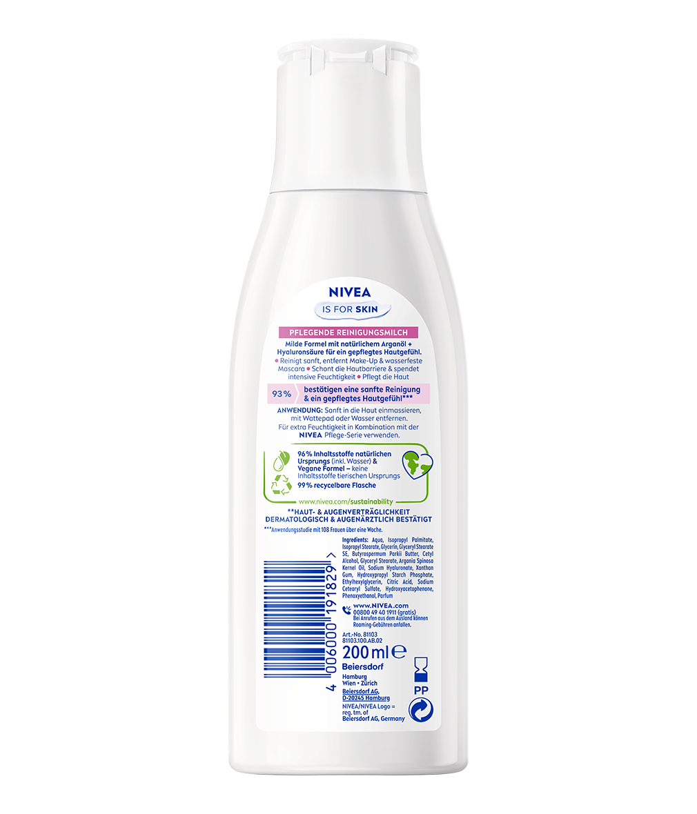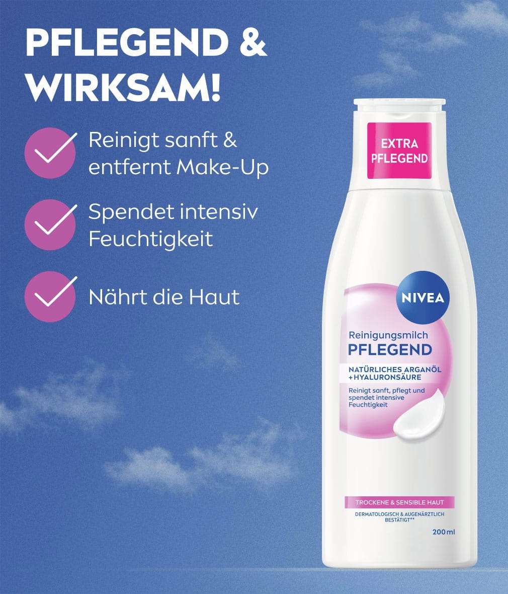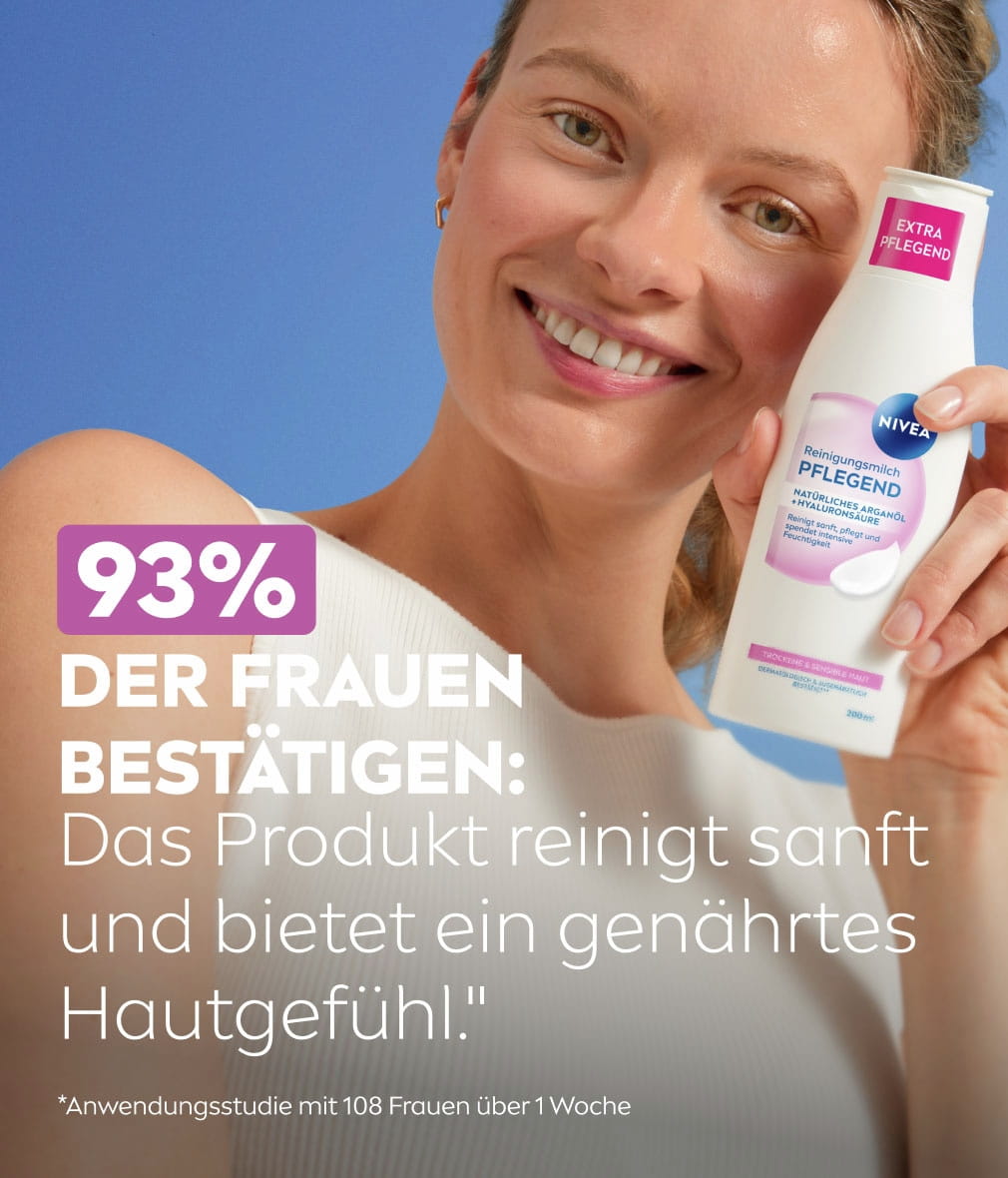 Angereichert mit Arganöl und Hyaluronsäure reinigt die Pflegende Reinigungsmilch die Haut sanft. Sie entfernt nicht nur Make-Up, sondern spendet auch intensive Feuchtigkeit, beruhigt und pflegt die Haut. 93% bestätigen, dass sie sanft reinigt und ein gepflegtes Hautgefühl hinterlässt.