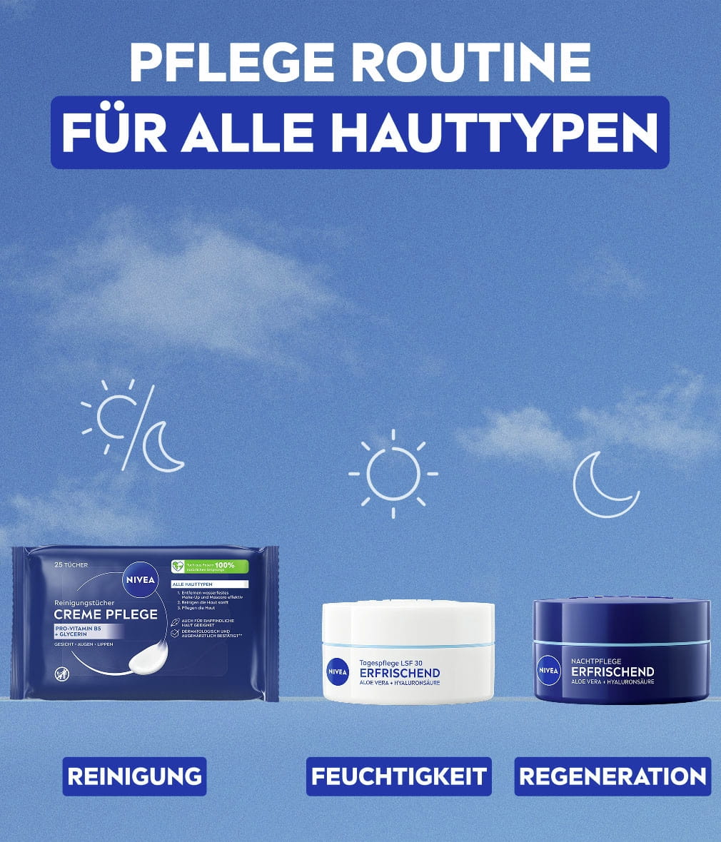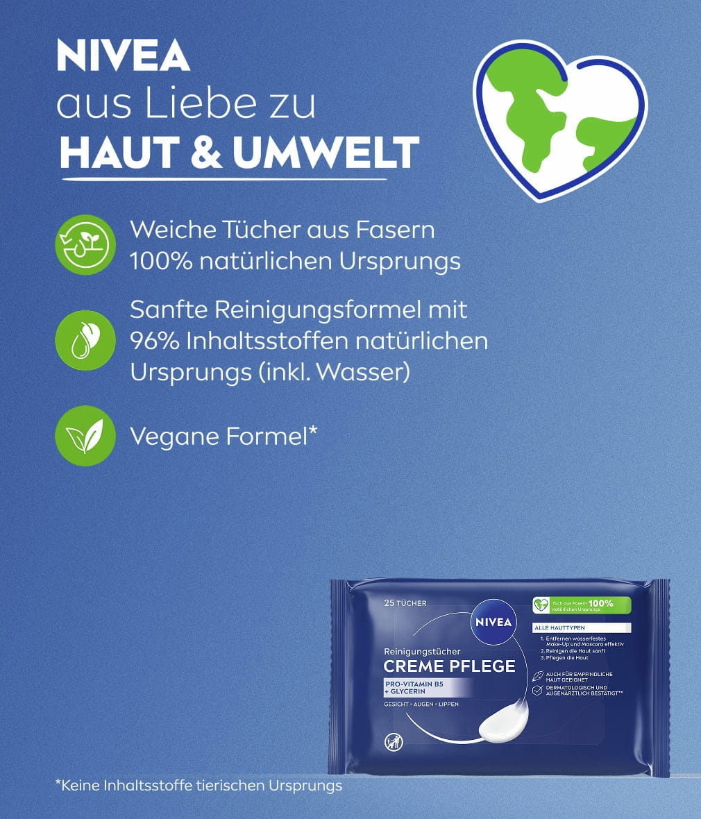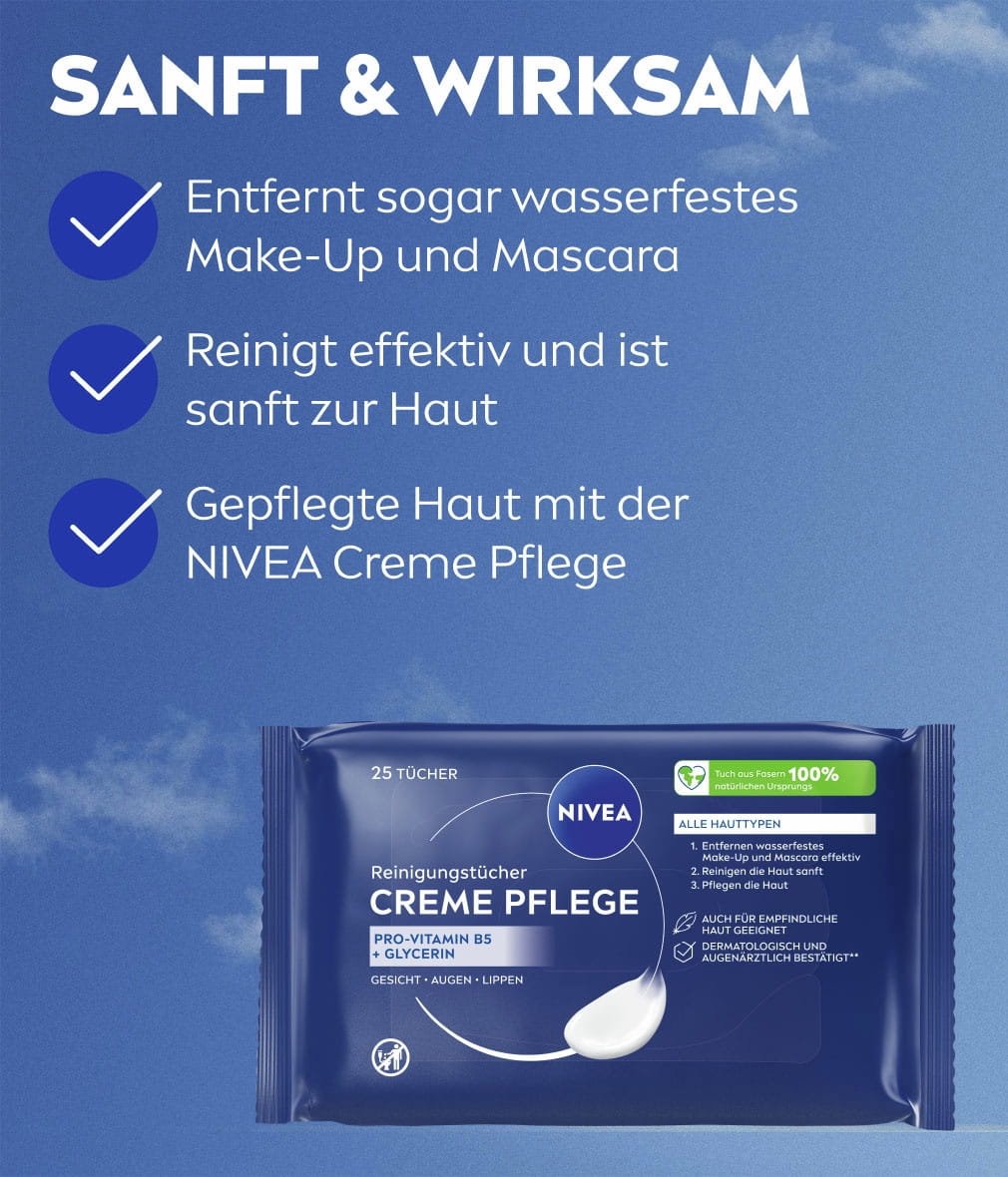 NIVEA Creme Pflege Reinigungstücher mit Creme Care Complex und dem ikonischen NIVEA Duft reinigen und pflegen die Haut sanft. Sie entfernen selbst wasserfestes Make-up gründlich und erhalten das Feuchtigkeitsgleichgewicht der Haut: NIVEA Creme Pflege Reinigungstücher, 25 Stück.