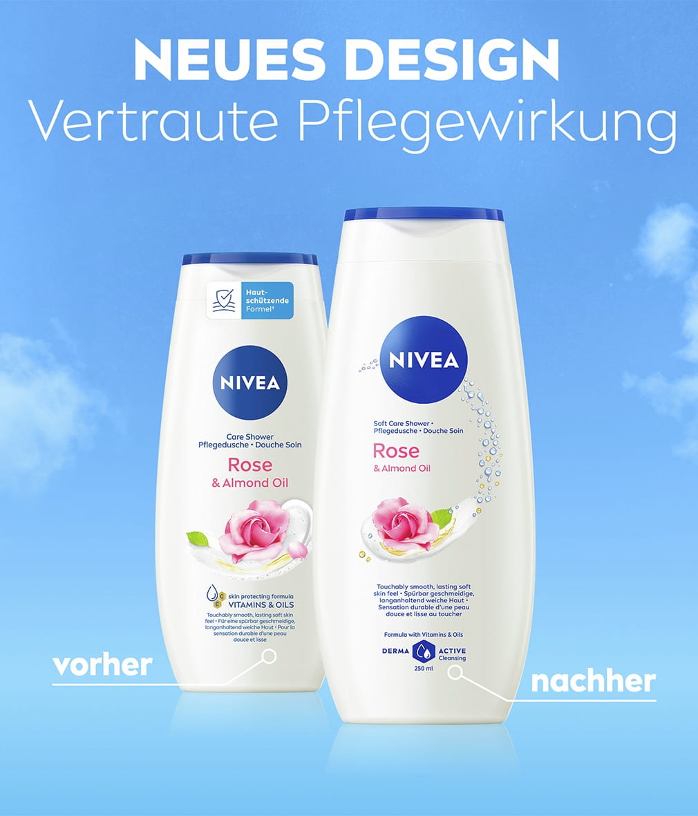 NIVEA Rose & Almond Oil Pflegedusche für ein spürbar glattes und langanhaltendes Hautgefühl. Mit Vitamin C & E und wertvollen Ölen formuliert, schützt es die Haut vor dem Austrocknen: NIVEA Rose & Almond Oil Pflegedusche.
