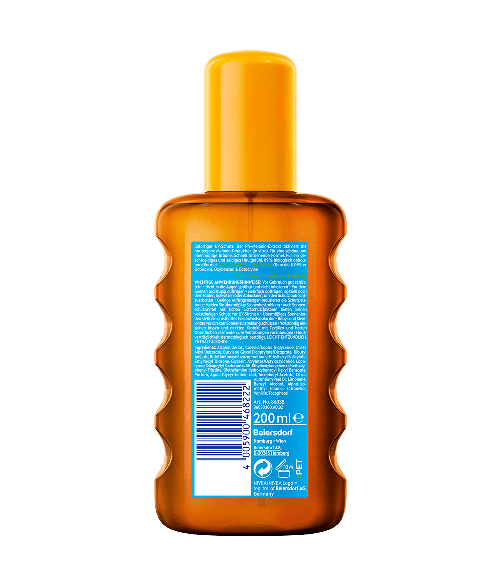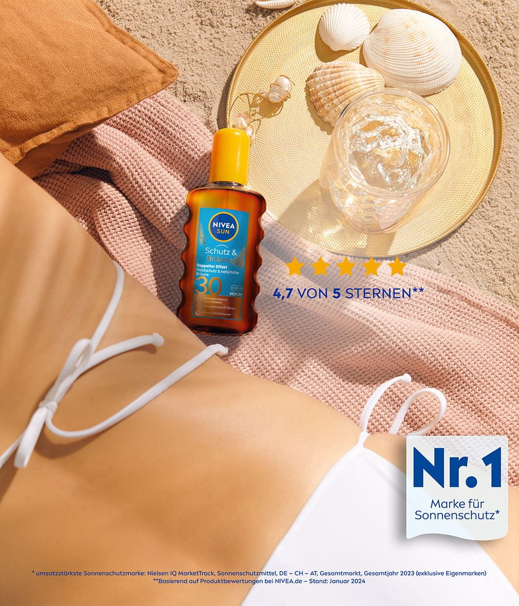 Der Sonnenschutz für eine schöne und gleichmäßige Bräune. Doppelter Effekt: Hautschutz & natürliche Bräune mit bewährter Melaninaktivierung. NIVEA SUN Schutz & Bräune Öl-Spray.