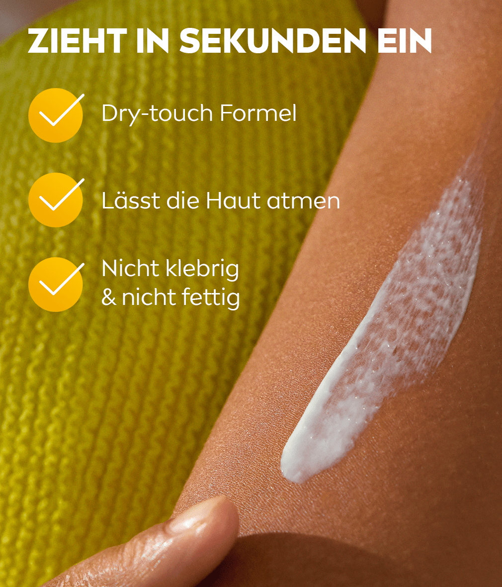 • Die Dry-Touch-Formel zieht in Sekundenschnelle ein, bietet tiefenwirksame Feuchtigkeit, ohne einen weißen Film zu hinterlassen – für ein gesundes, weiches Hautgefühl.