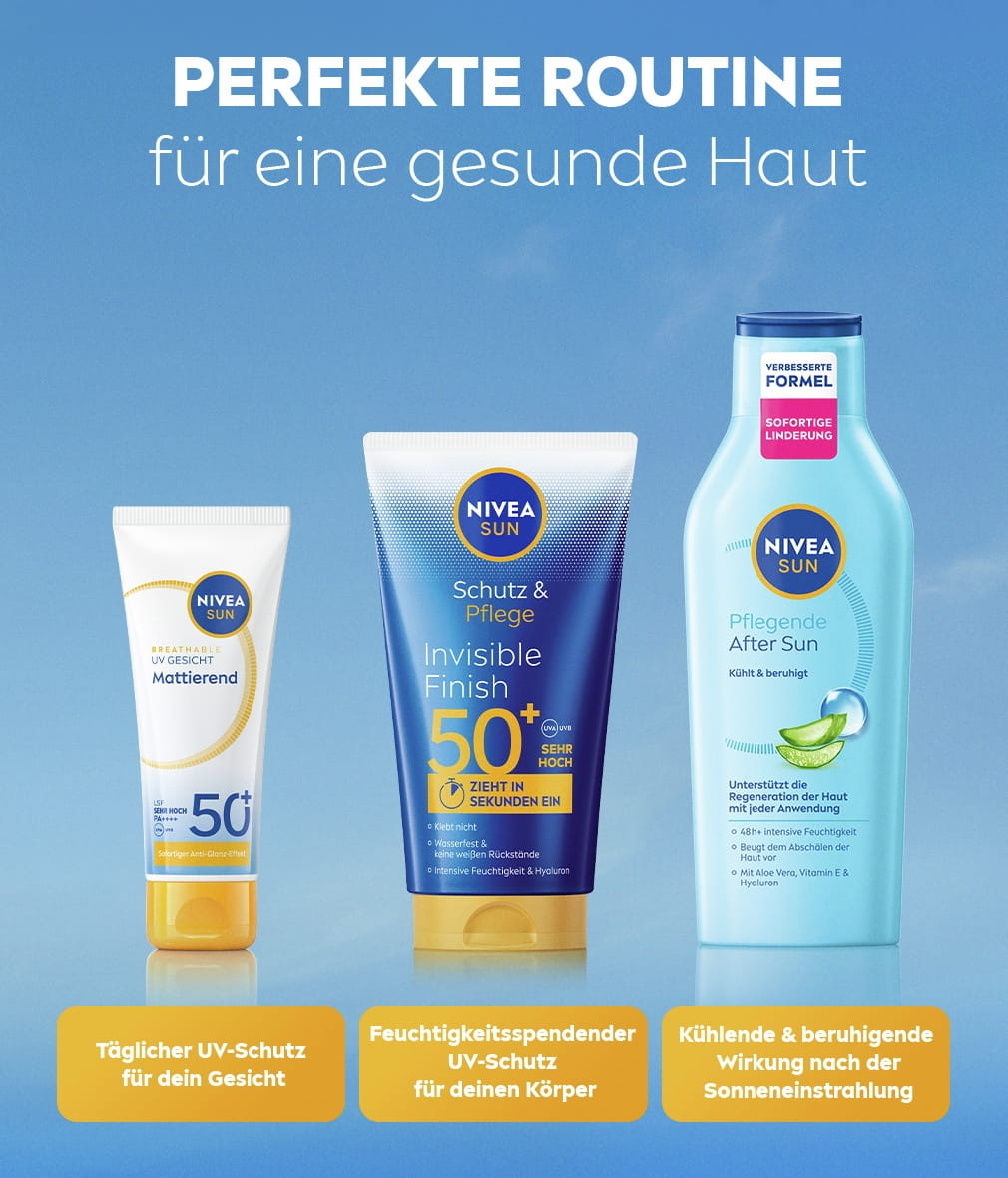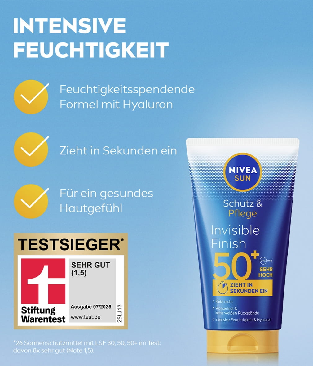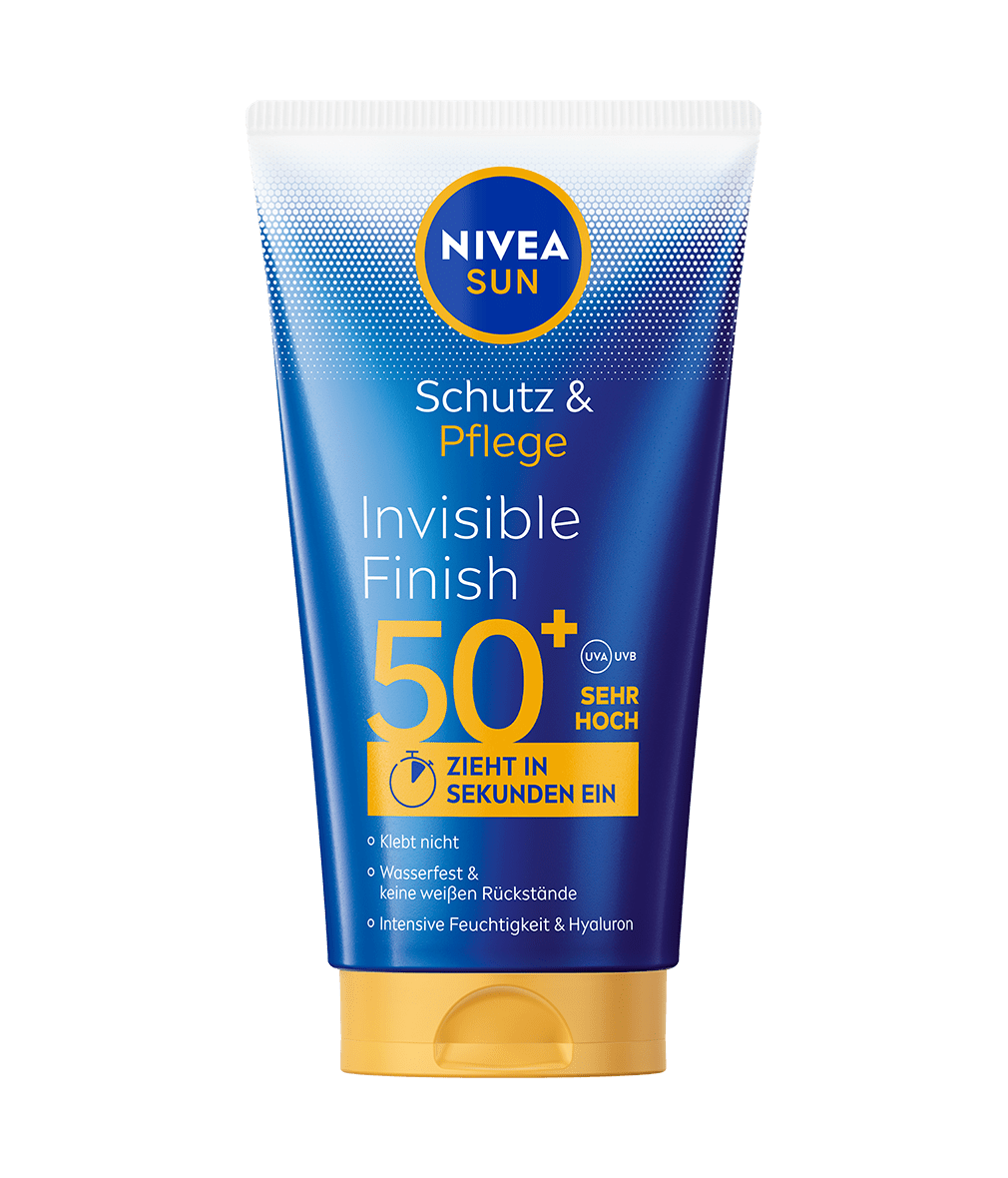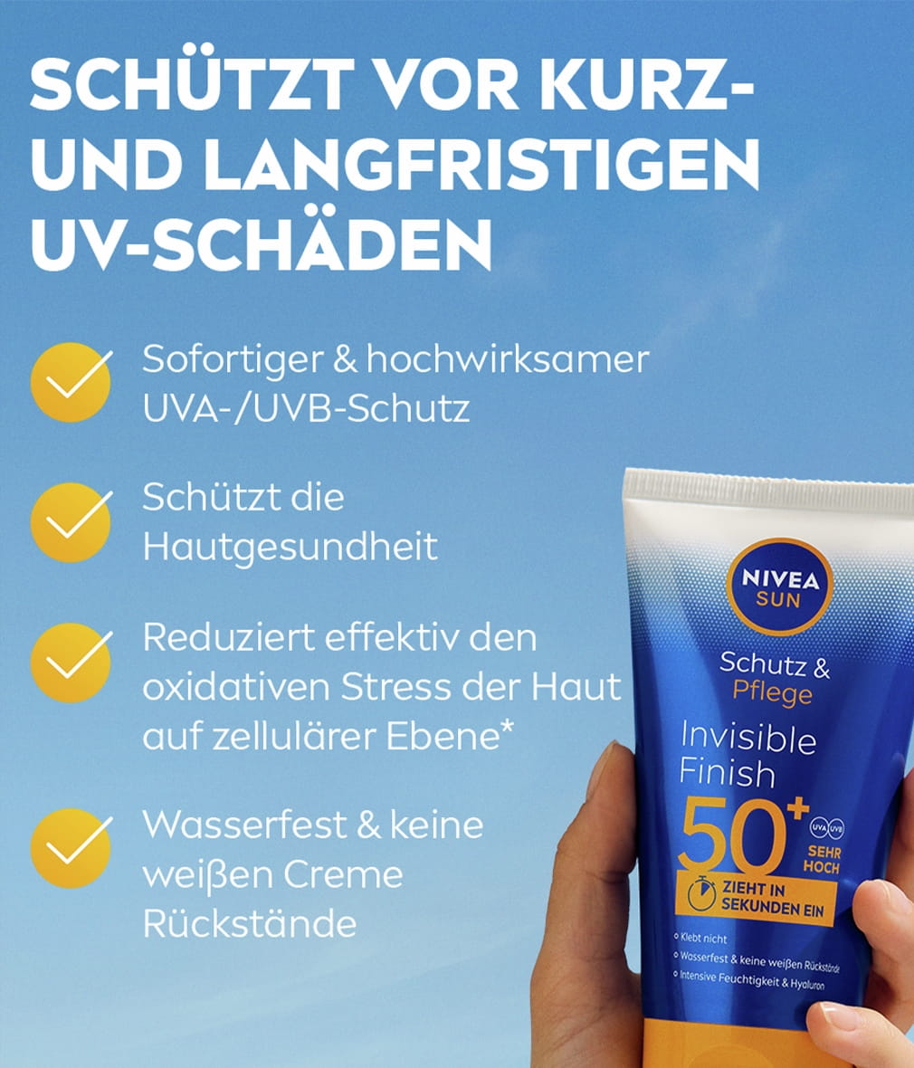 Bietet zuverlässigen UVA/UVB-Schutz und intensive Feuchtigkeit mit Hyaluron. Schützt vor kurz- und langfristigen UV-Schäden: NIVEA SUN Schutz & Pflege Invisible Finish.