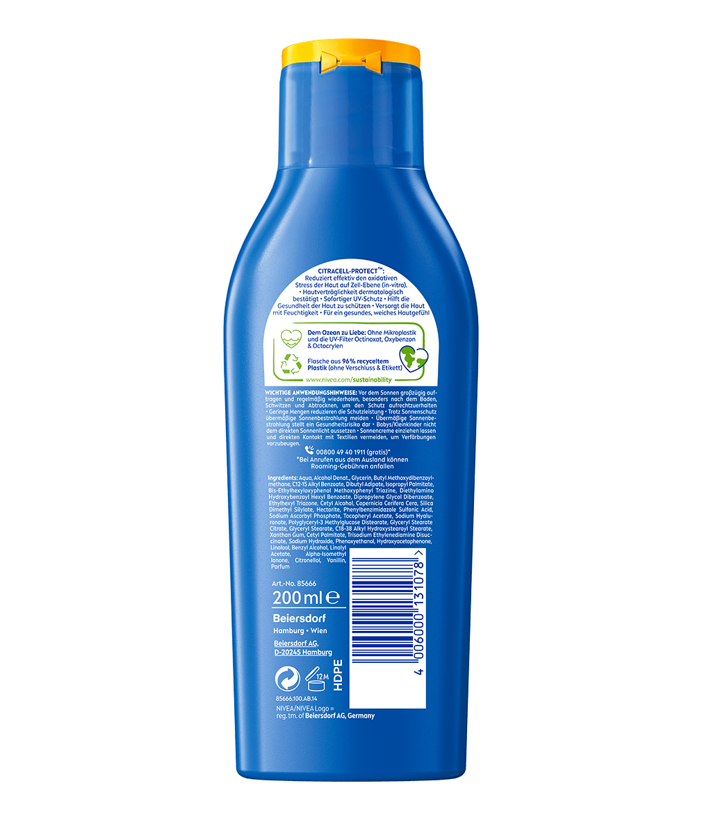 Sofortiger UV-Schutz und 48 Stunden Feuchtigkeit mit CitraCell-Protect™-Technologie, die vor kurz- und langfristigen UV-Schäden schützt: NIVEA SUN Schutz & Pflege Sonnenlotion LSF 50