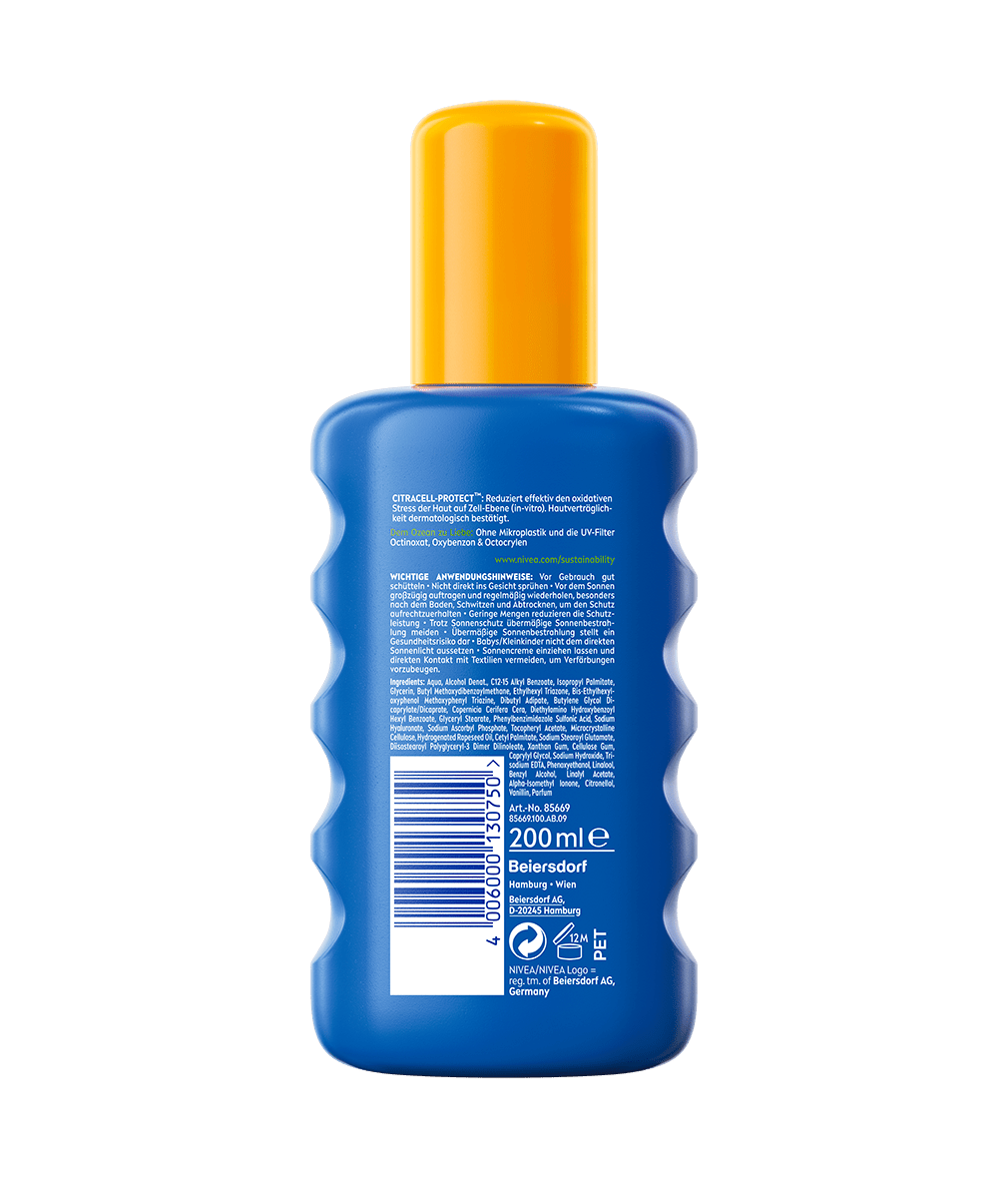 Sofortiger UV-Schutz und 48 Stunden Feuchtigkeit mit CitraCell-Protect™-Technologie, die vor kurz- und langfristigen UV-Schäden schützt: NIVEA SUN Schutz & Pflege Sonnenspray.