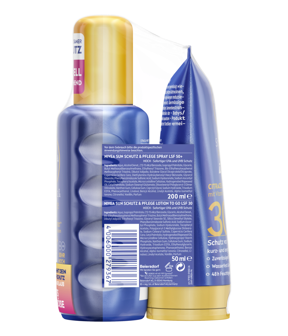 Sofortiger UV-Schutz und 48 Stunden Feuchtigkeit mit CitraCell-Protect™-Technologie, die vor kurz- und langfristigen UV-Schäden schützt: NIVEA SUN Schutz & Pflege Sonnenspray. Sofortiger UV-Schutz und 48 Stunden Feuchtigkeit mit CitraCell-Protect™-Technologie, die vor kurz- und langfristigen UV-Schäden schützt: NIVEA SUN Schutz & Pflege To Go Tube LSF 30.