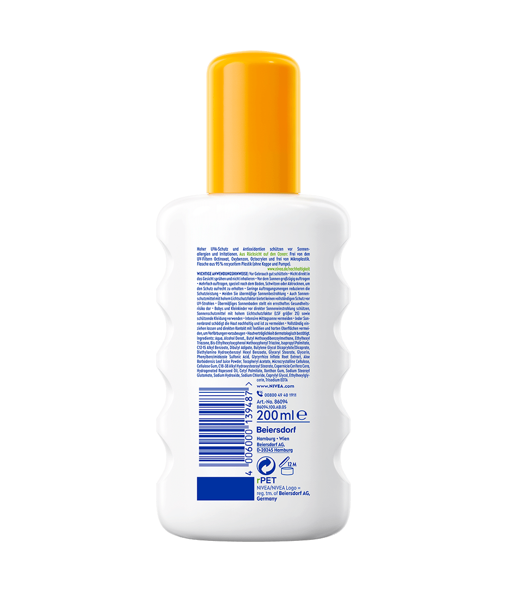 WICHTIGE ANWENDUNGSHINWEISE: Nicht direkt in das Gesicht sprühen und nicht inhalieren • Vor dem Sonnen großzügig auftragen • Mehrfach auftragen, speziell nach dem Baden, Schwitzen oder Abtrocknen, um den Schutz aufrecht zu erhalten • Geringe Auftragungsmengen reduzieren die Schutzleistung • Meiden Sie übermäßige Sonnenbestrahlung • Auch Sonnenschutzmittel mit hohem Lichtschutzfaktor bietet keinen vollständigen Schutz vor UV-Strahlen • Übermäßiges Sonnenbaden stellt ein ernsthaftes Gesundheitsrisiko dar • Babys und Kleinkinder vor direkter Sonneneinstrahlung schützen, Sonnenschutzmittel mit hohem Lichtschutzfaktor (LSF größer 25) sowie schützende Kleidung verwenden • Intensive Mittagsonne vermeiden • Jeder Sonnenbrand schädigt die Haut nachhaltig und ist zu vermeiden • Vollständig einziehen lassen und direkten Kontakt mit Textilien und harten Oberflächen vermeiden, um Verfärbungen vorzubeugen • Hautverträglichkeit dermatologisch bestätigt