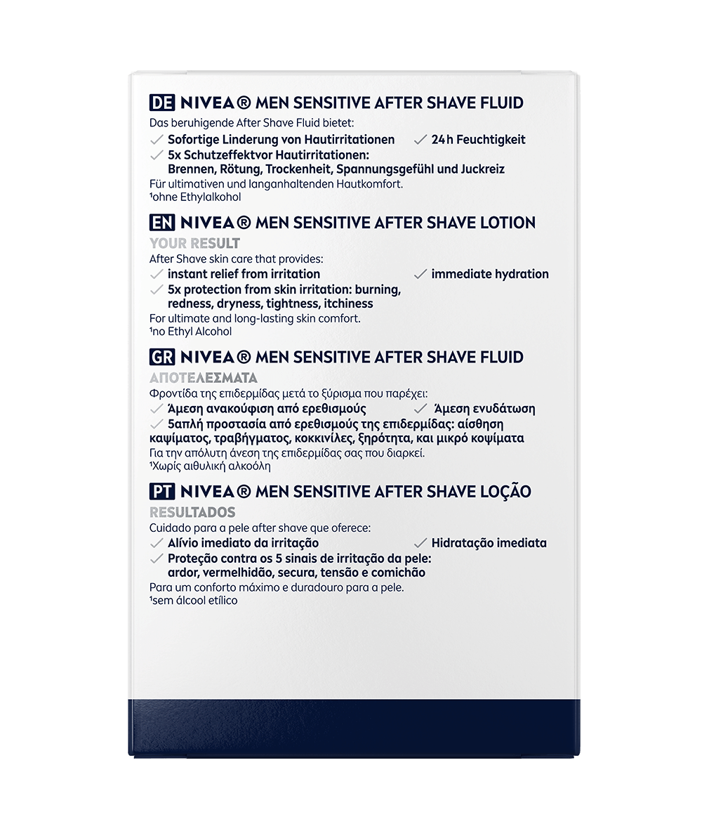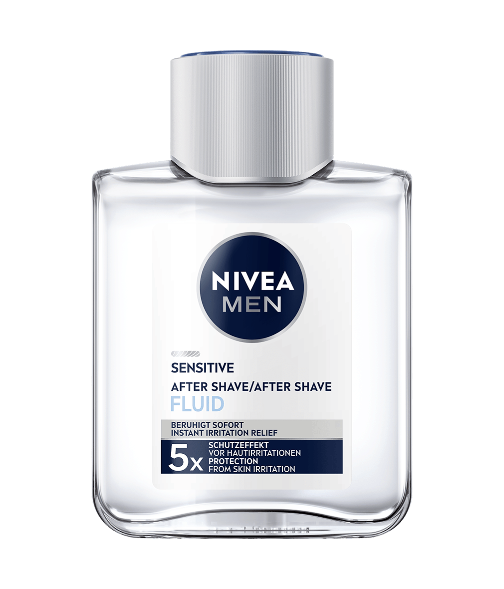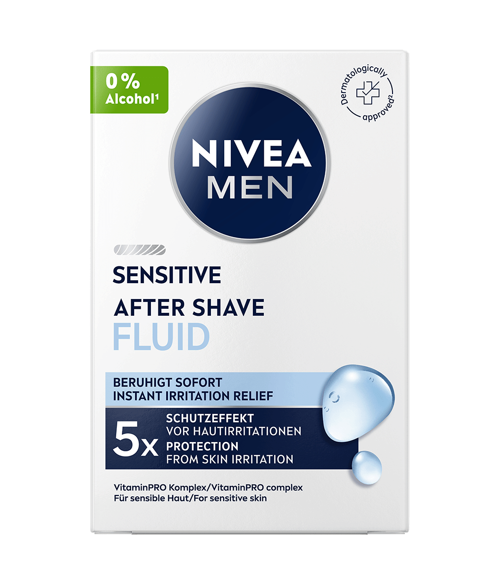 NIVEA MEN Sensitive After Shave Fluid beruhigt empfindliche Haut sofort, spendet Feuchtigkeit und lindert Rötungen – alkoholfrei, mit Vitamin E, B5 und Kamille für ein frisches, gepflegtes Hautgefühl.