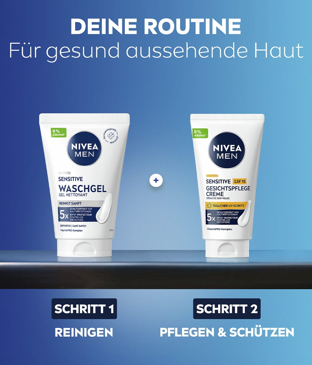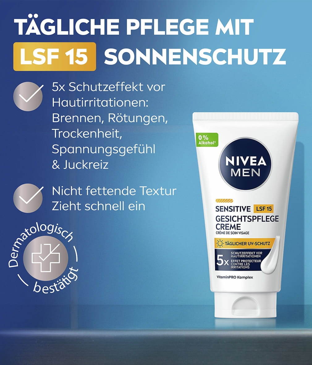 NIVEA MEN Sensitive LSF15 Feuchtigkeitscreme: Bei gereizter Haut bietet diese pflegende Gesichtscreme mit VitaminPro-Komplex den ganzen Tag Linderung und schützt mit LSF15.