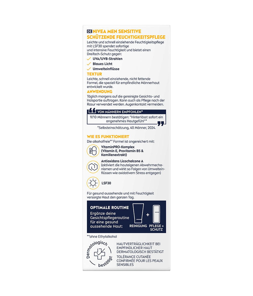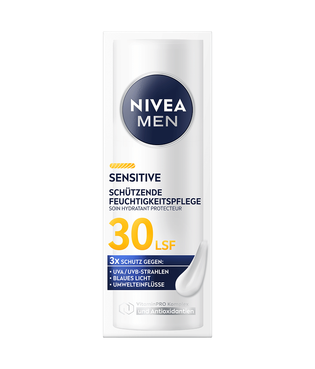 Die NIVEA MEN Sensitive Schützende Feuchtigkeitspflege LSF30 schützt empfindliche Haut mit LSF30, VitaminPRO-Komplex und Antioxidantien. Leicht, nicht fettend und alkoholfrei*, bietet sie 3-fachen Schutz gegen UVA/UVB-Strahlen, blaues Licht und Umwelteinflüsse für gesunde aussehende Haut jeden Tag.