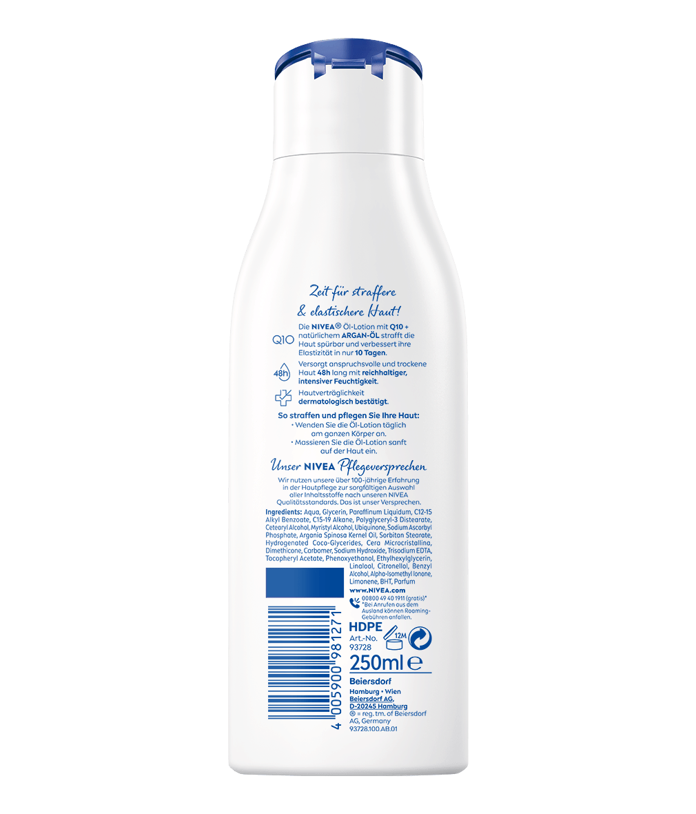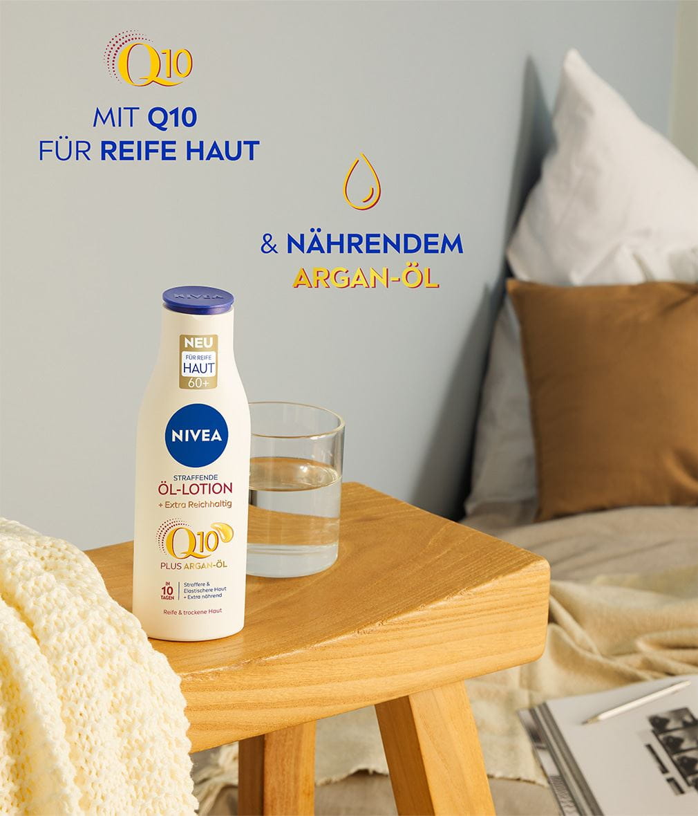Die NIVEA Q10 Öl-Lotion spendet reifer Haut 48h lang intensive Feuchtigkeit. Sie ist angereichert mit Q10 und natürlichem ARGAN-ÖL und verbessert die Hautelastizität in nur 10 Tagen.
