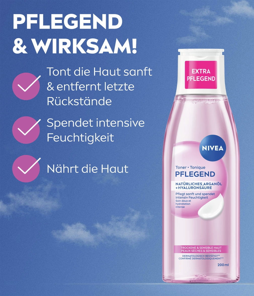 Sanft klärend & reinigend mit dem NIVEA Pflegenden Toner. Spendet Feuchtigkeit und beruhigt die Haut, ohne auszutrocknen. Ideal für die tägliche Anwendung.