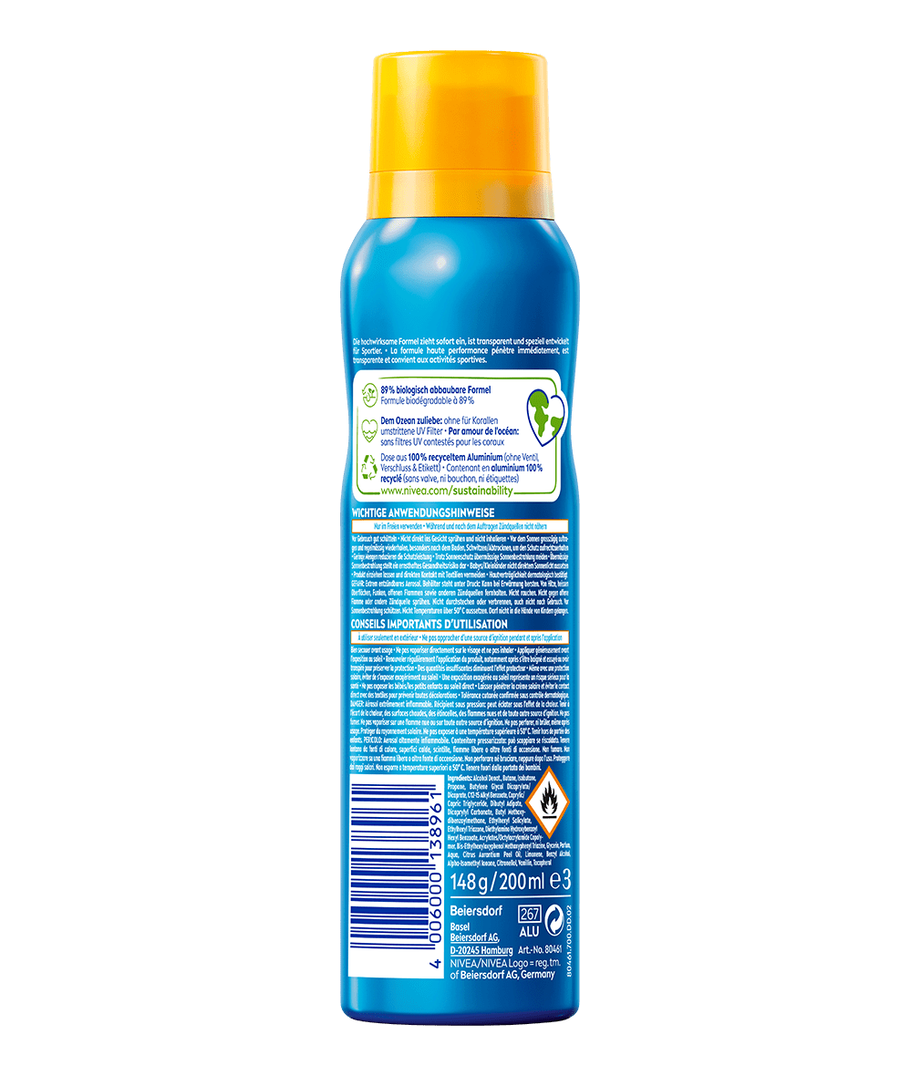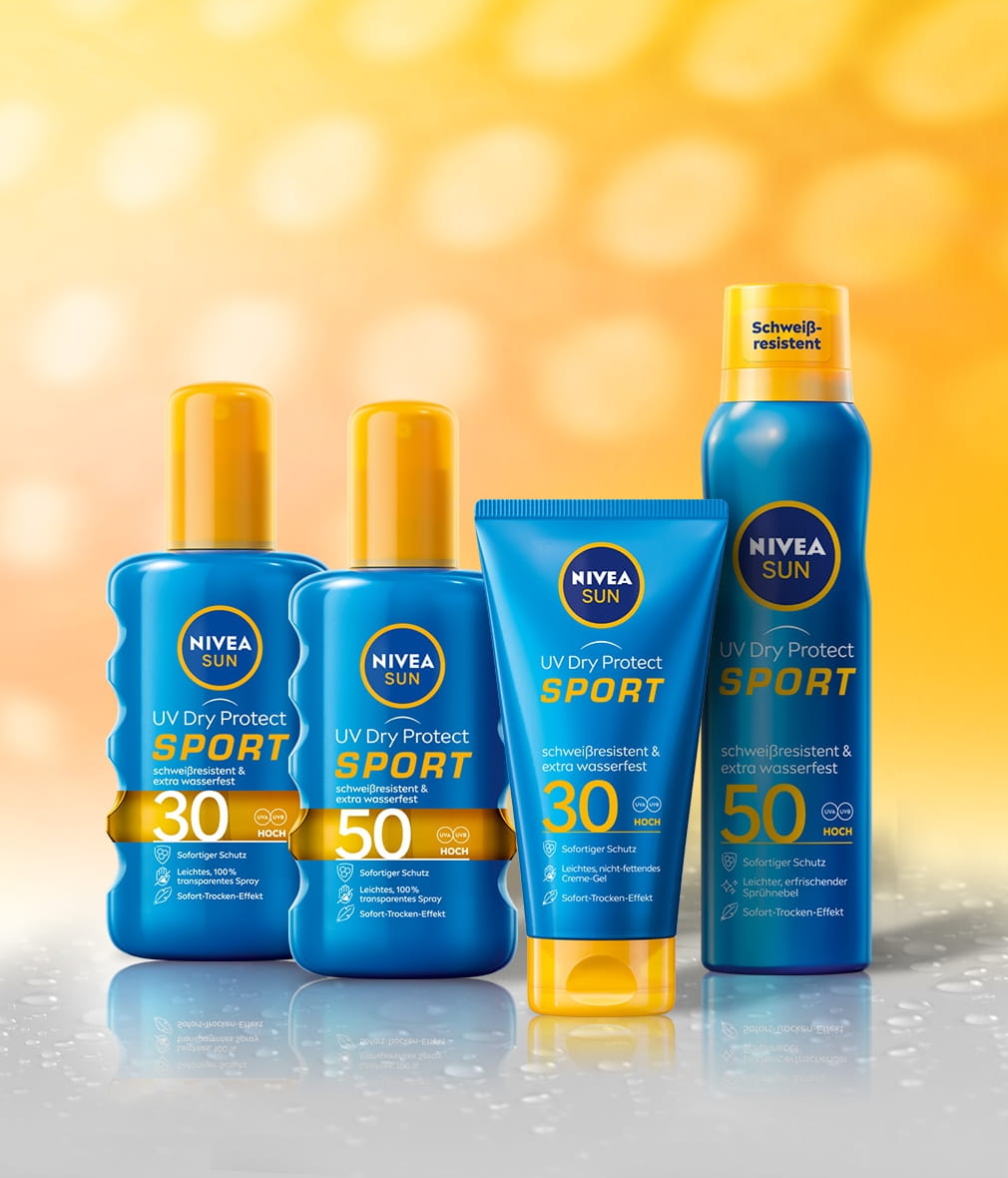 Der erfrischende Sprühnebel bietet hochwirksamen Schutz vor UV-Strahlen. Schweißresistent & extra wasserfest. Perfekt für sportliche Aktivitäten: NIVEA SUN UV Dry Protect Sport Sonnenspray LSF 50.