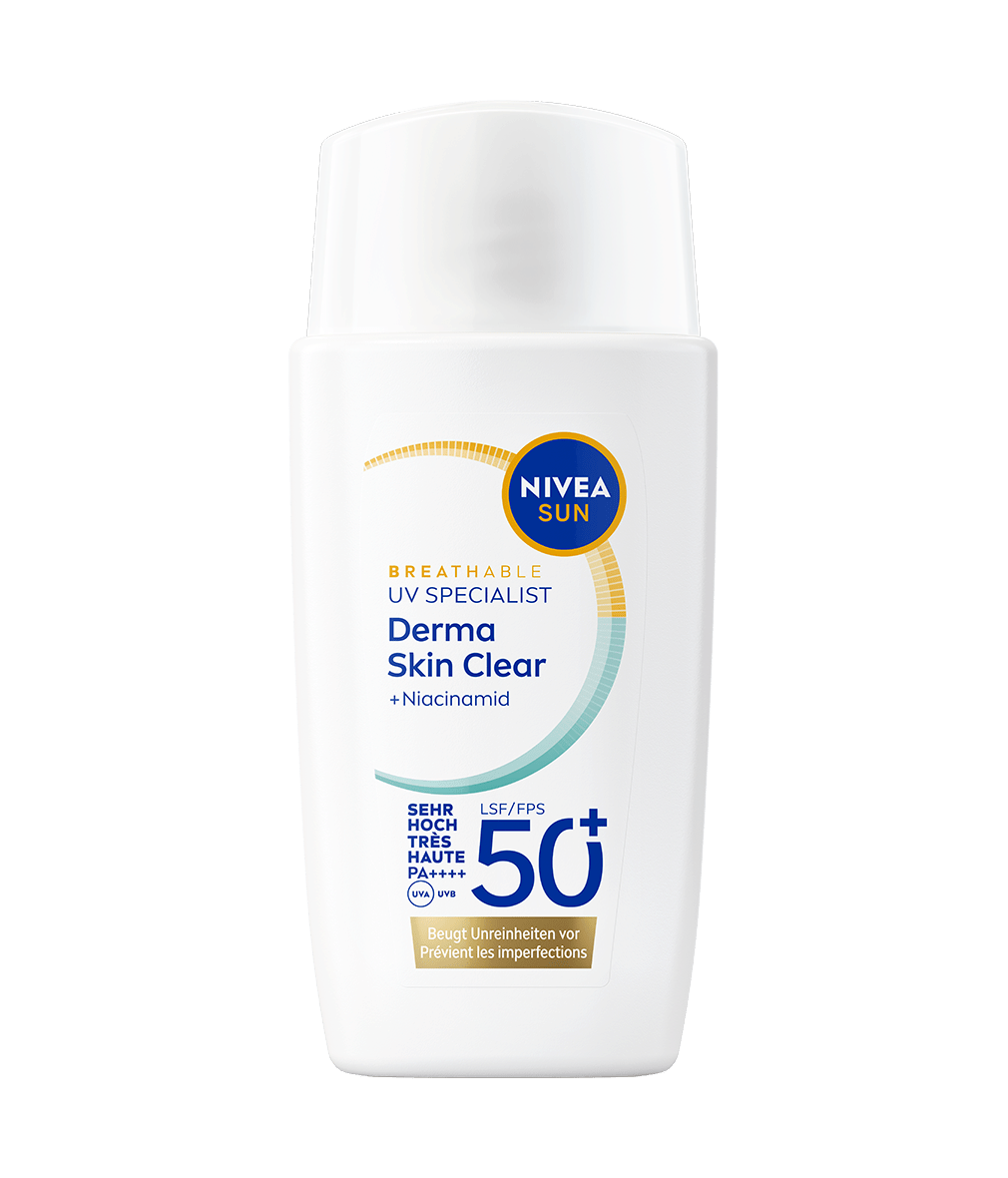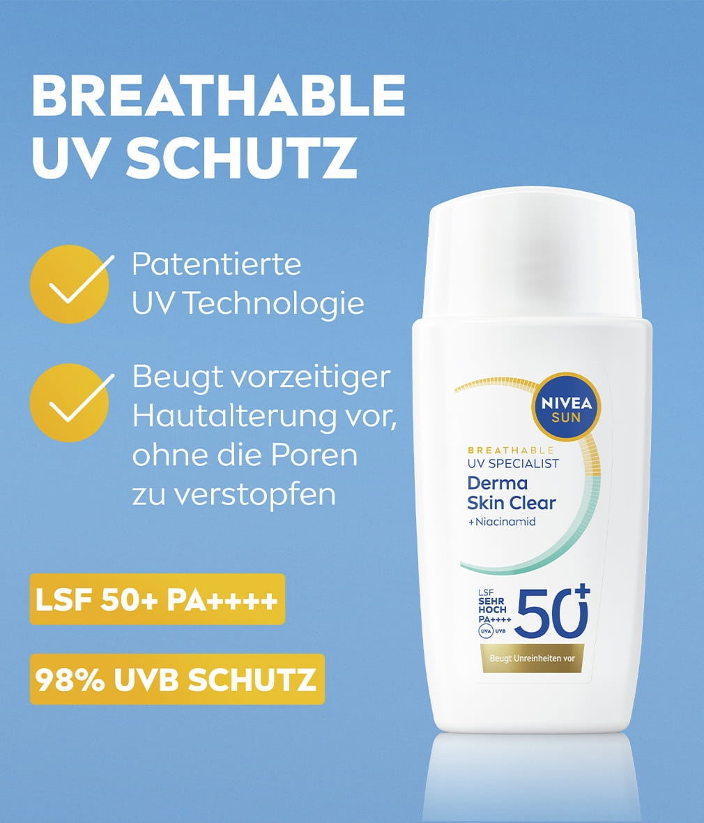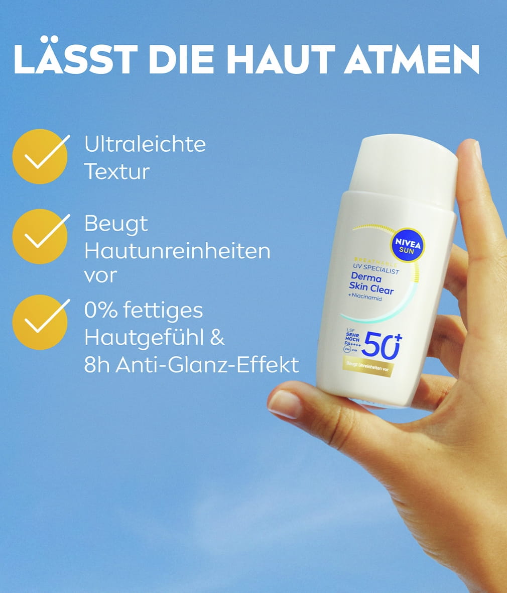NIVEA SUN Breathable UV Specialist Derma Skin Clear LSF 50+ beugt vorzeitiger Hautalterung vor, ohne die Poren zu verstopfen. Beugt Hautunreinheiten vor und sorgt für einen 8h Anti-Glanz-Effekt.