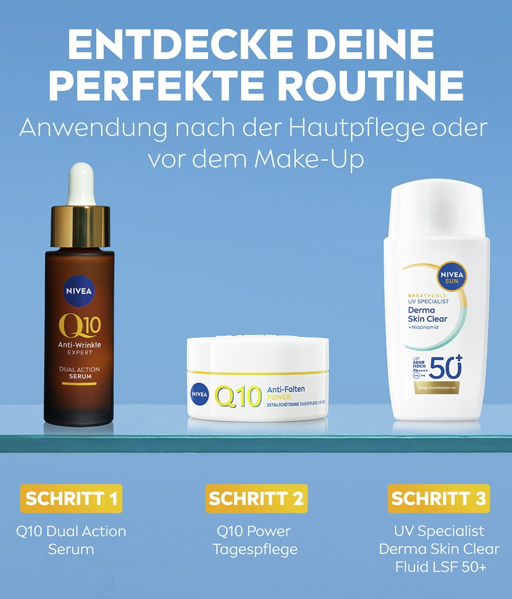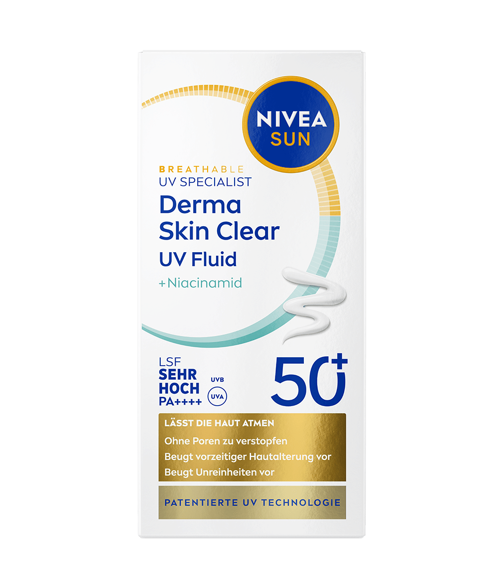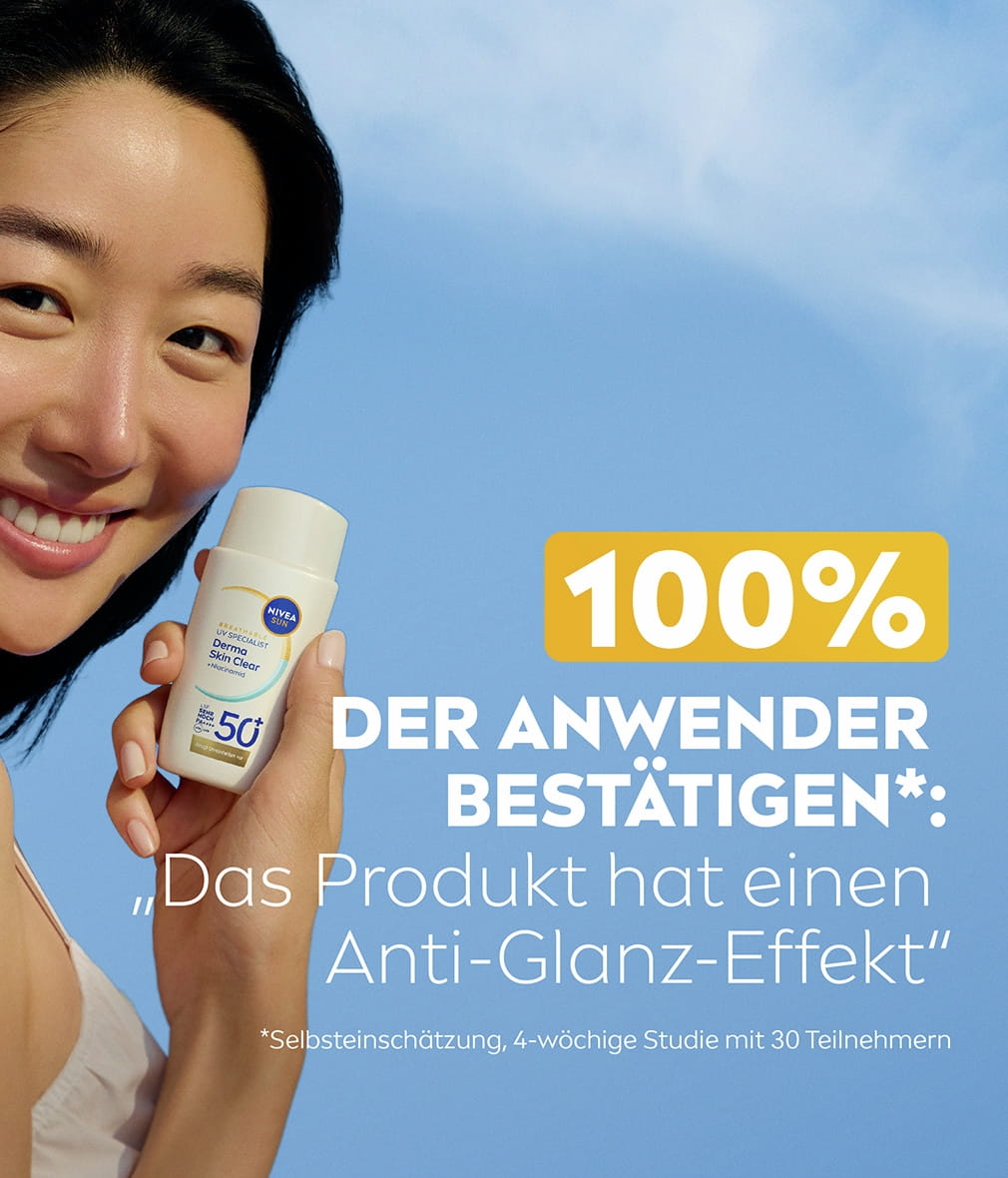 NIVEA SUN Breathable UV Specialist Derma Skin Clear LSF 50+ beugt vorzeitiger Hautalterung vor, ohne die Poren zu verstopfen. Beugt Hautunreinheiten vor und sorgt für einen 8h Anti-Glanz-Effekt.