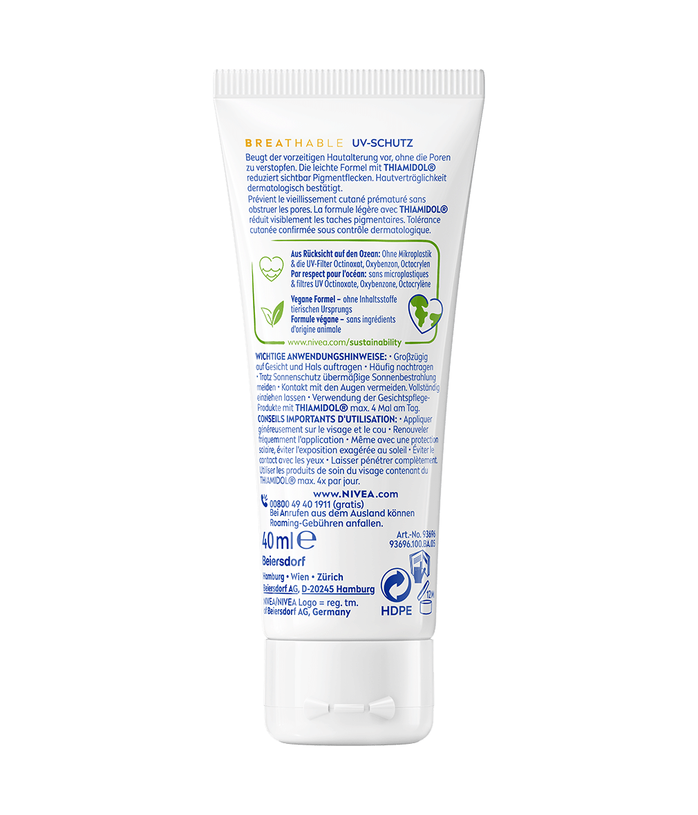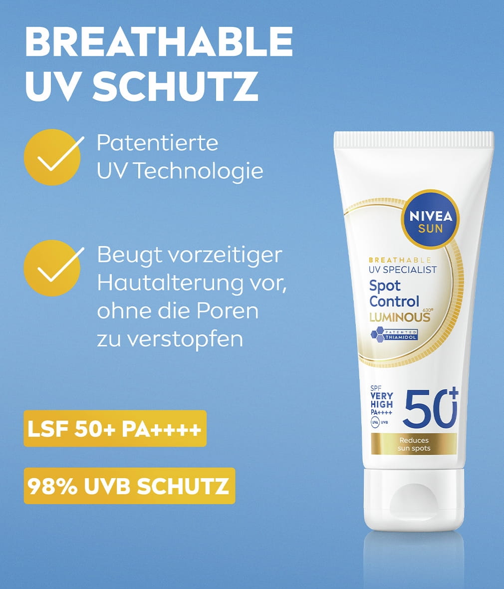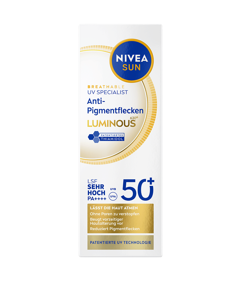 NIVEA SUN Breathable UV Specialist Anti-Pigmentflecken Luminous630® LSF 50+ beugt vorzeitiger Hautalterung vor, ohne die Poren zu verstopfen. Mit patentiertem Thiamidol® - reduziert sichtbar Pigmentflecken in nur 4 Wochen.
