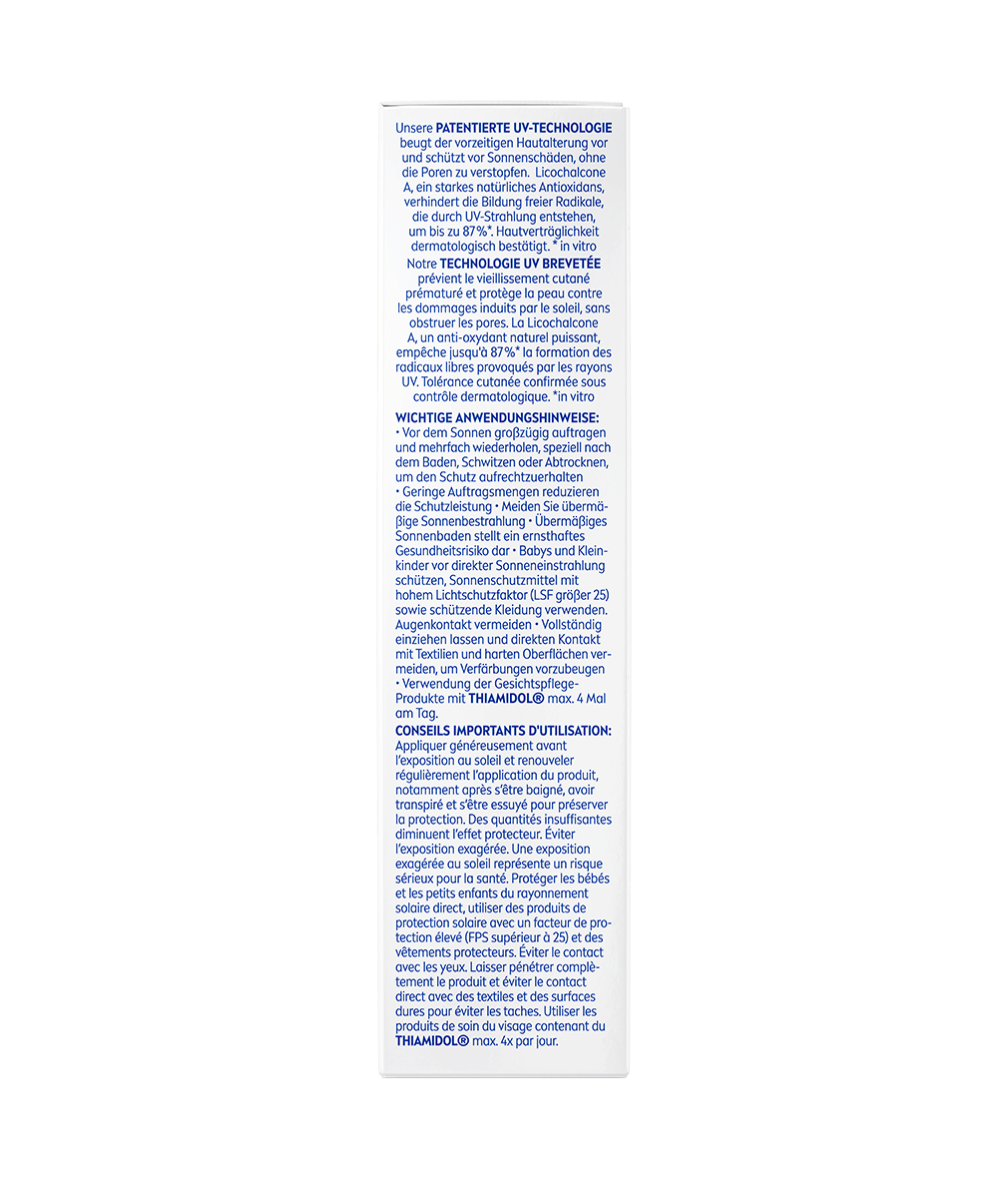 Wichtige Anwendungshinweise: Vor dem Sonnen großzügig auftragen und mehrfach wiederholen, speziell nach dem Baden, Schwitzen oder Abtrocknen, um den Schutz aufrechtzuerhalten. Geringe Auftragsmengen reduzieren die Schutzleistung. Meiden Sie übermäßige Sonnenbestrahlung. Übermäßiges Sonnenbaden stellt ein ernsthaftes Gesundheitsrisiko dar. Babys und Kleinkinder vor direkter Sonneneinstrahlung schützen, Sonnenschutzmittel mit hohem Lichtschutzfaktor (LSF größer 25) sowie schützende Kleidung verwenden. Augenkontakt vermeiden. Vollständig einziehen lassen und direkten Kontakt mit Textilien und harten Oberflächen vermeiden, um Verfärbungen vorzubeugen. Verwendung der Gesichtspflege-Produkte mit THIAMIDOL® max. 4 Mal am Tag.