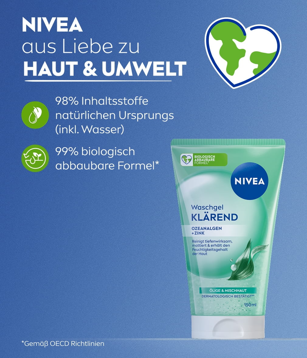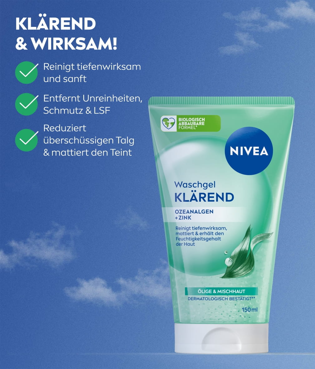 Für ein klares und mattiertes Hautbild – das NIVEA Klärende Waschgel reinigt porentief mit klärender Peeling-Wirkung.