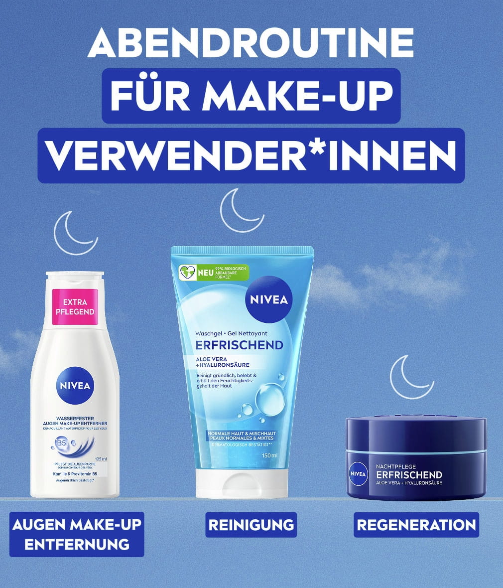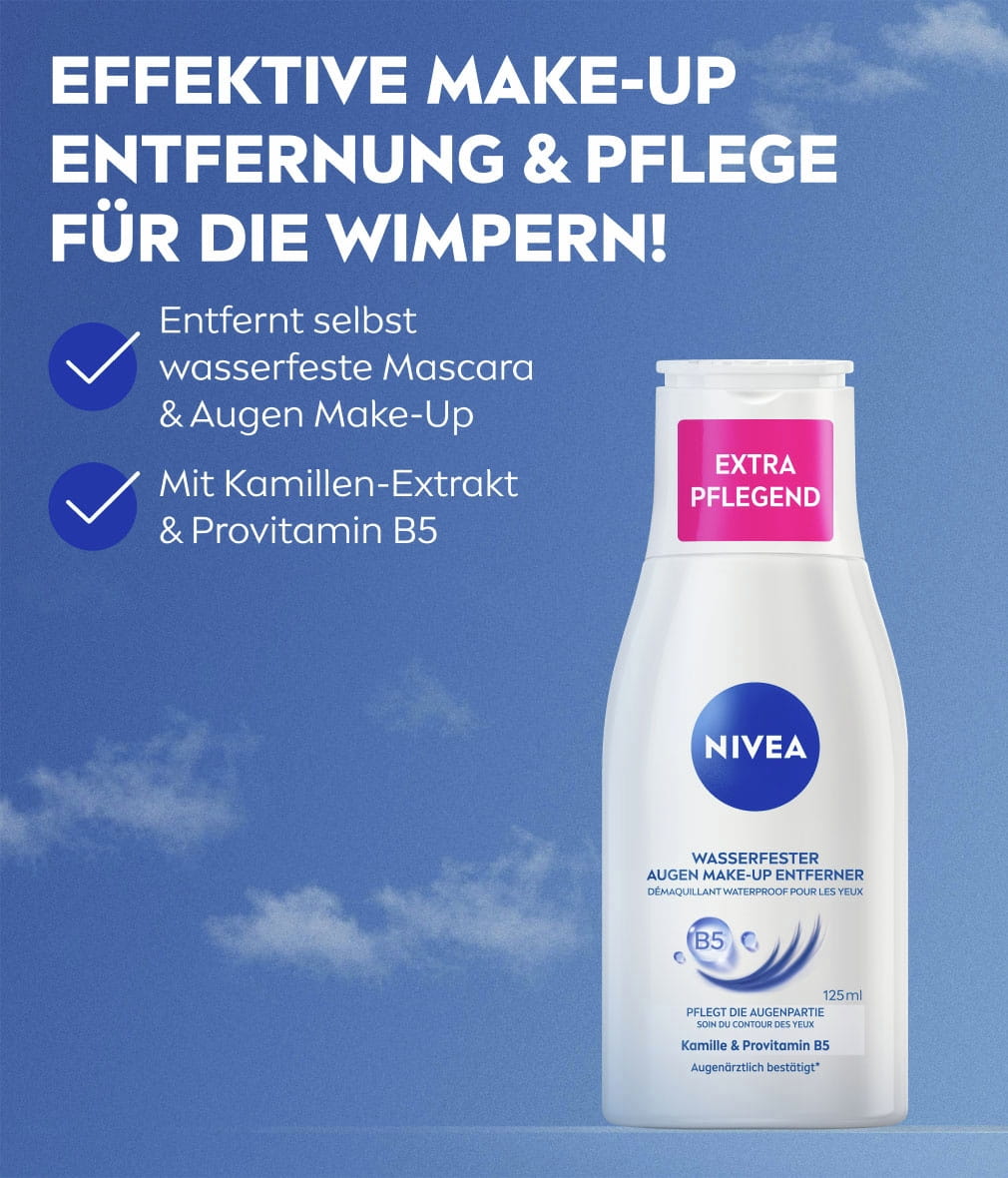 Der NIVEA Wasserfeste Augen Make-up Entferner reinigt die sensible Augenpartie und entfernt wasserfeste Mascara und Make-up.