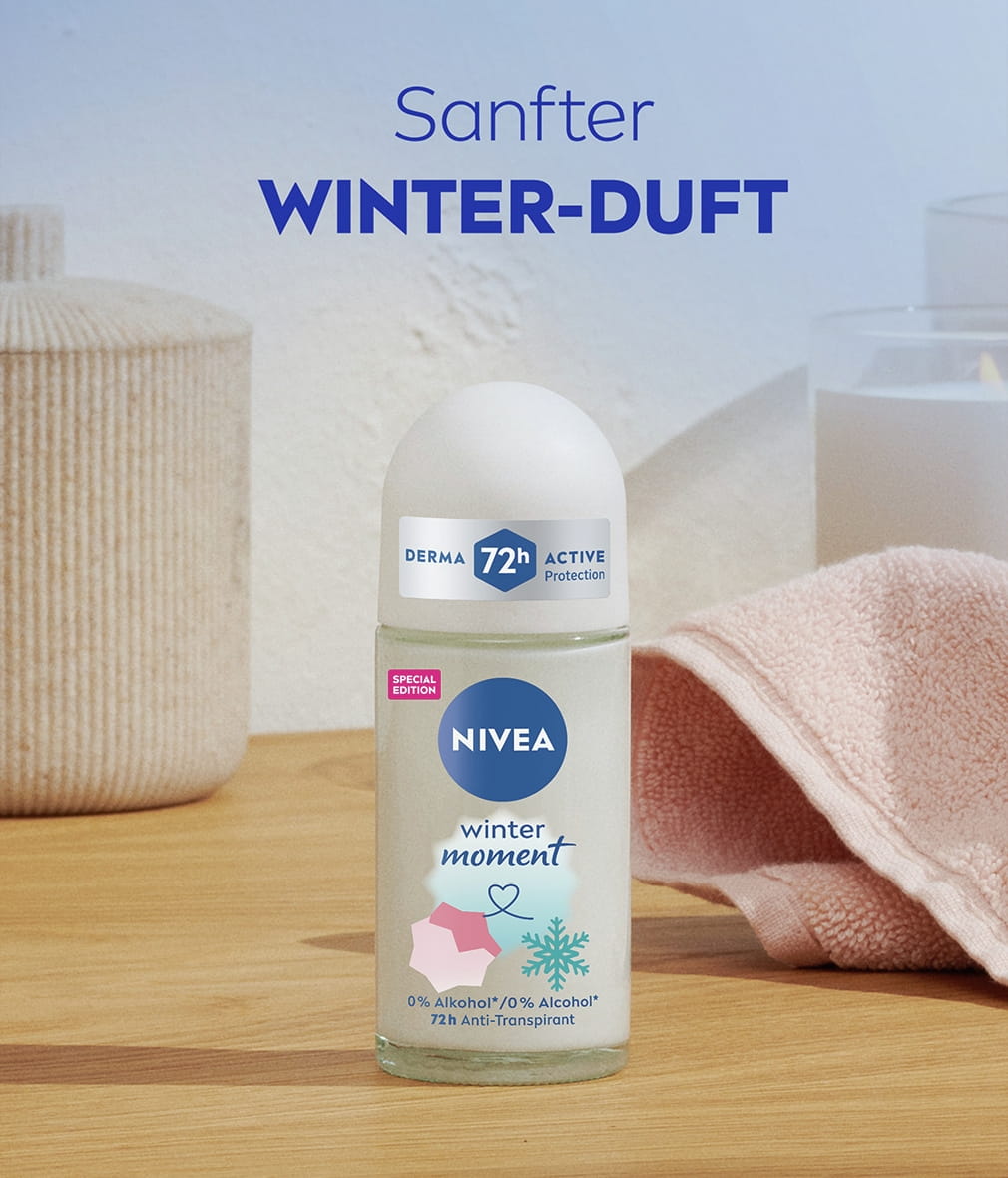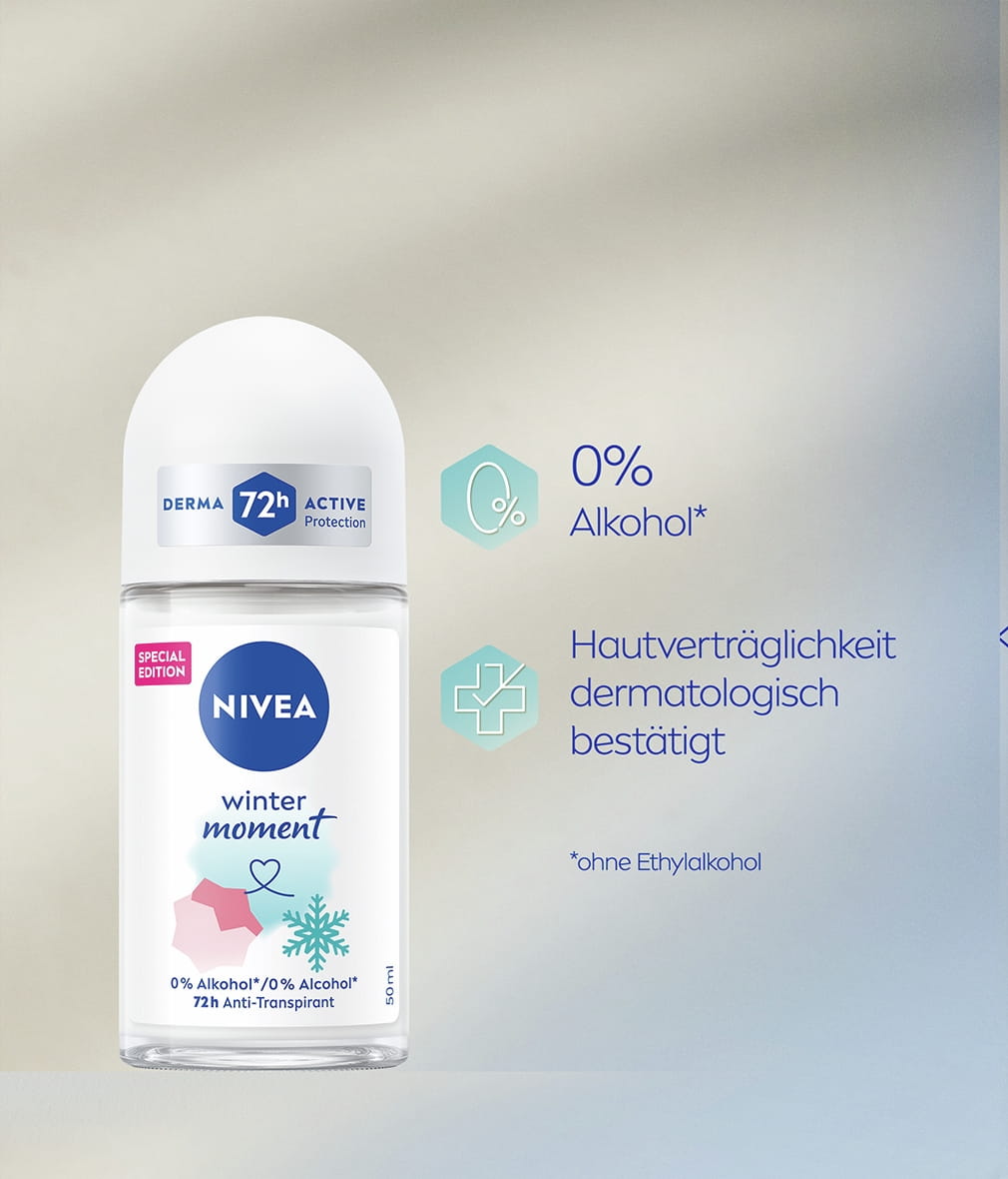 NIVEA Winter Moment Deo Roll-On. Schnelles Trocknen und ein samtig weiches Hautgefühl mit einem sanften Winterduft. Zuverlässiger 72h Antitranspirant-Schutz, der Ihre Haut pflegt.
